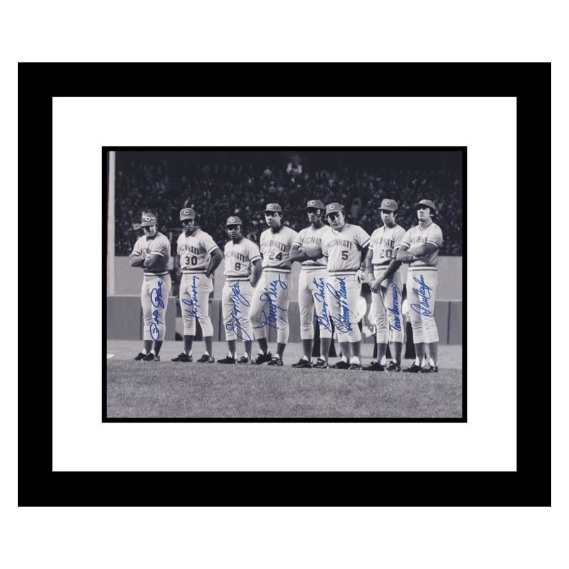 "Big Red Machine Line-Up" is a lithograph featuring signatures from the Big Red Machine's starting eight; Johnny Bench (c), Tony Perez (1b), Joe Morgan (2b), Dave Concepcion (ss), Pete Rose (3b), Ken Griffey (rf), Cesar Geronimo (cf) and Geoge Foster (lf). The Reds became the first NL team since the 1921-1922 New York Giants to win consecutive World Series championships. The Big Red Machine of 1975-1976 is considered one of the best teams ever. This piece comes framed. Includes Certificate of Authenticity. Measures approx. 26" x 22" (frame), 20" x 16" (image).