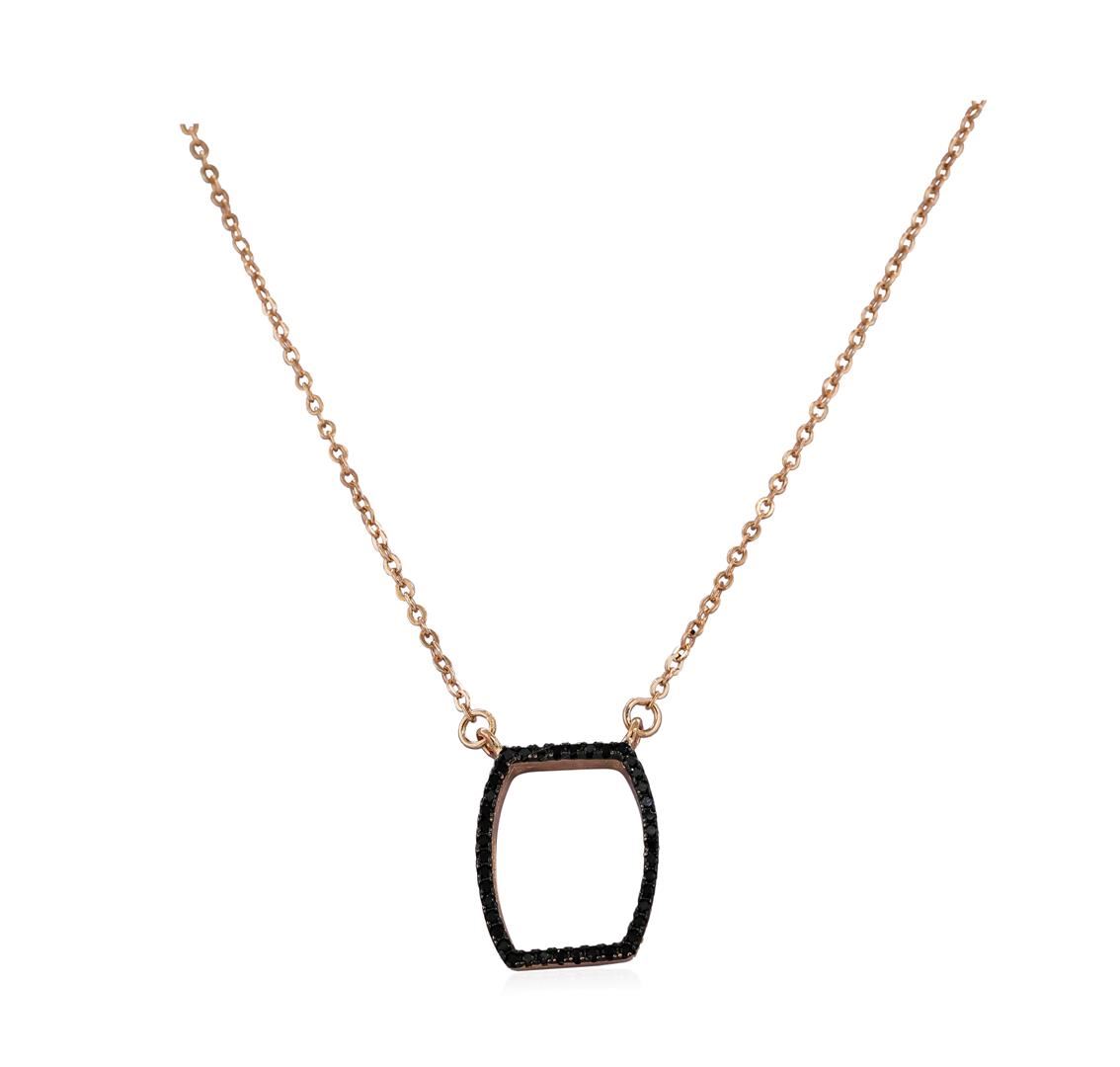 High end designer jewelry. Black CZ Pendant Necklace - Rose Gold Plated. Rose Gold Pltd- Slv925 Chain. Black/ Rose. 16/3inches. Total Weight: 2.4 grams.