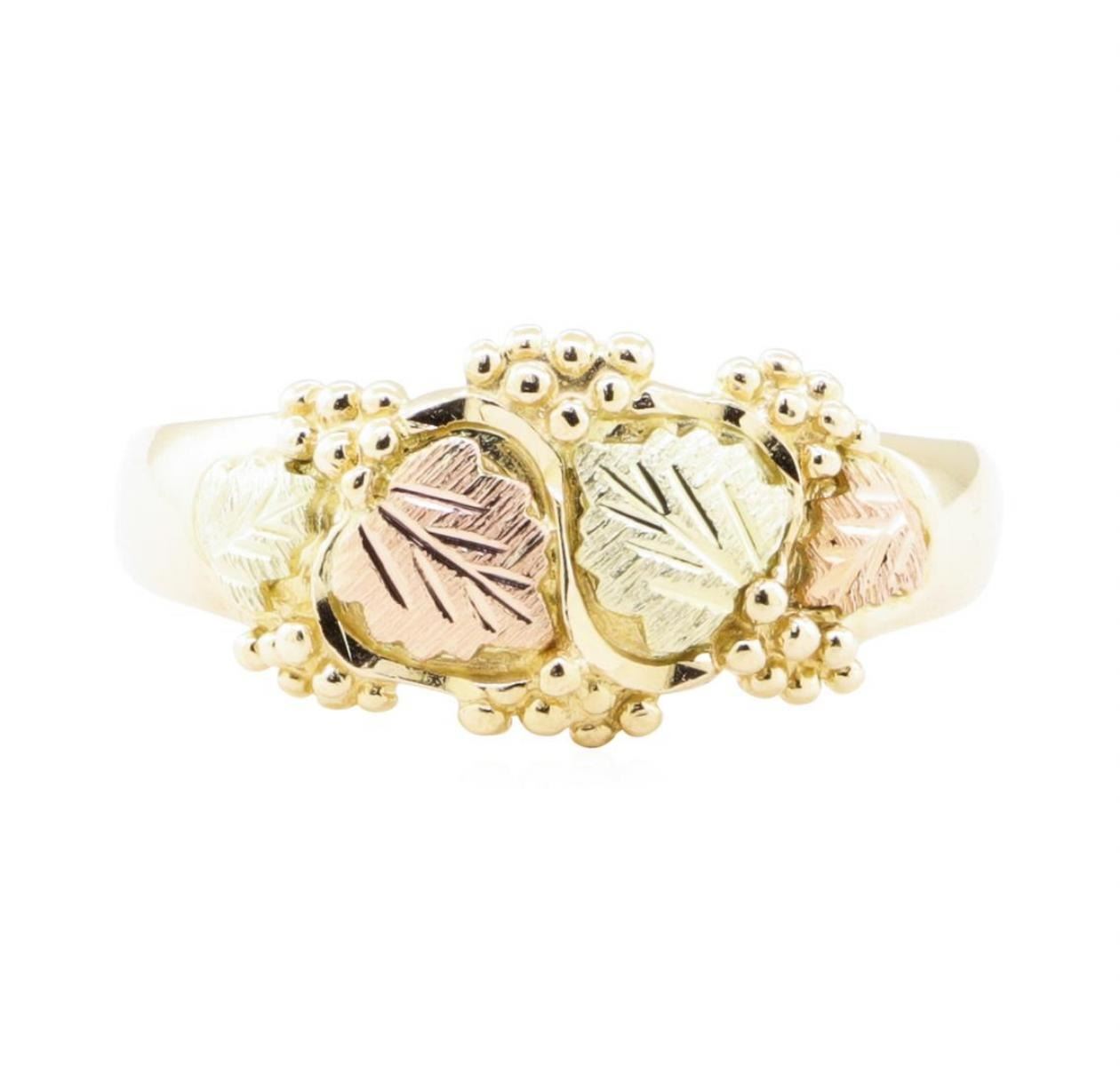 One Black Hills gold motif ring featuring: 10KT yellow, pink, and green gold weighing 4.2 grams.