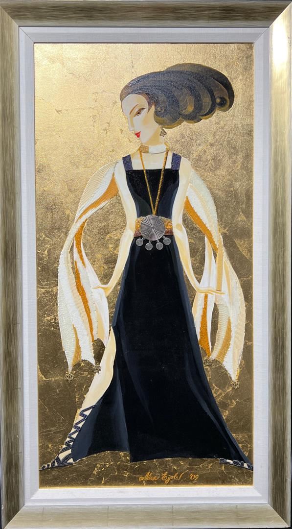 Black and Gold Glamour II by Eydel, Alina. Original One-of-a-Kind Hand Signed Acrylic on Canvas Framed. Frame has some marks. Dimensions: 35.5 x 17.5. Artwork Excellent, Frame Good.