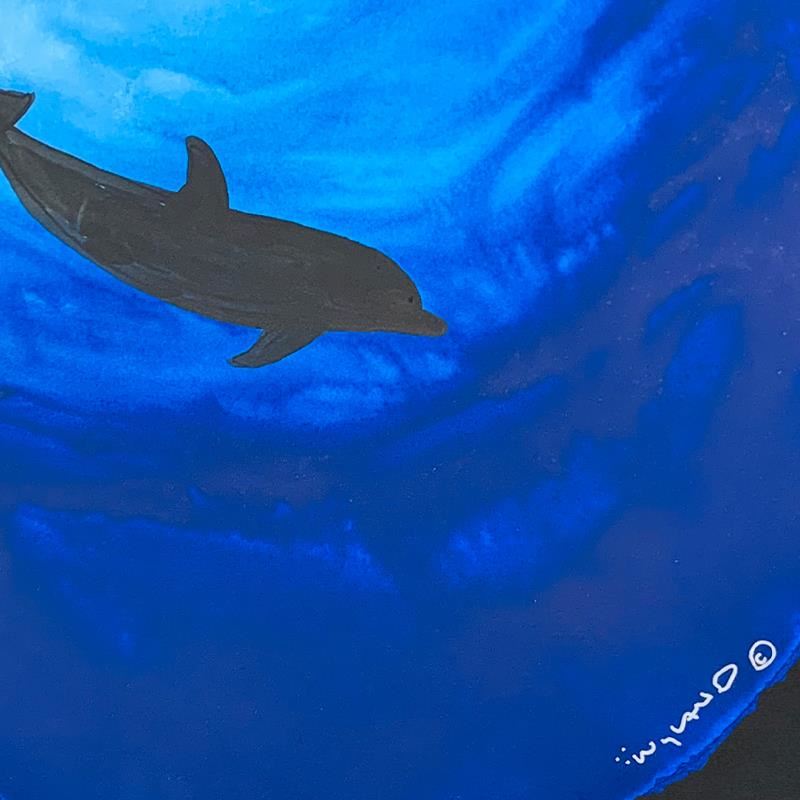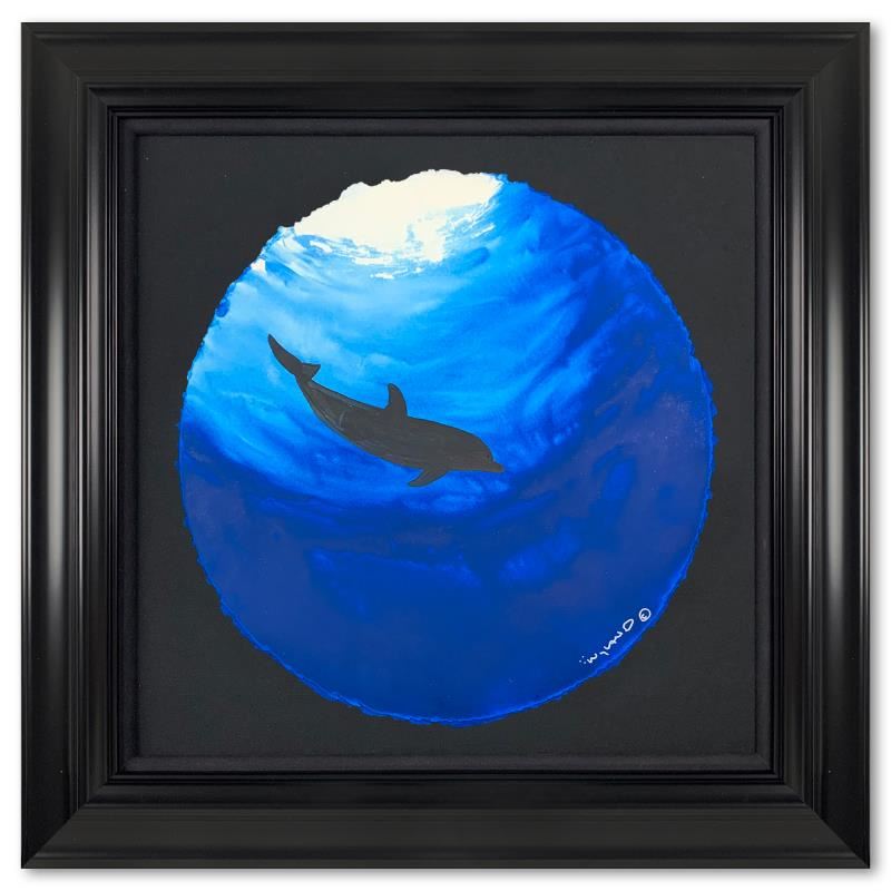 "Blue Sea Dolphin" is an original painting, watercolor on deckle edge paper by Wyland. Hand signed by the artist, the piece comes custom framed and with a letter of authenticity. Measures approximately 30" x 30" (framed), 19.5" x 19.5" (image).