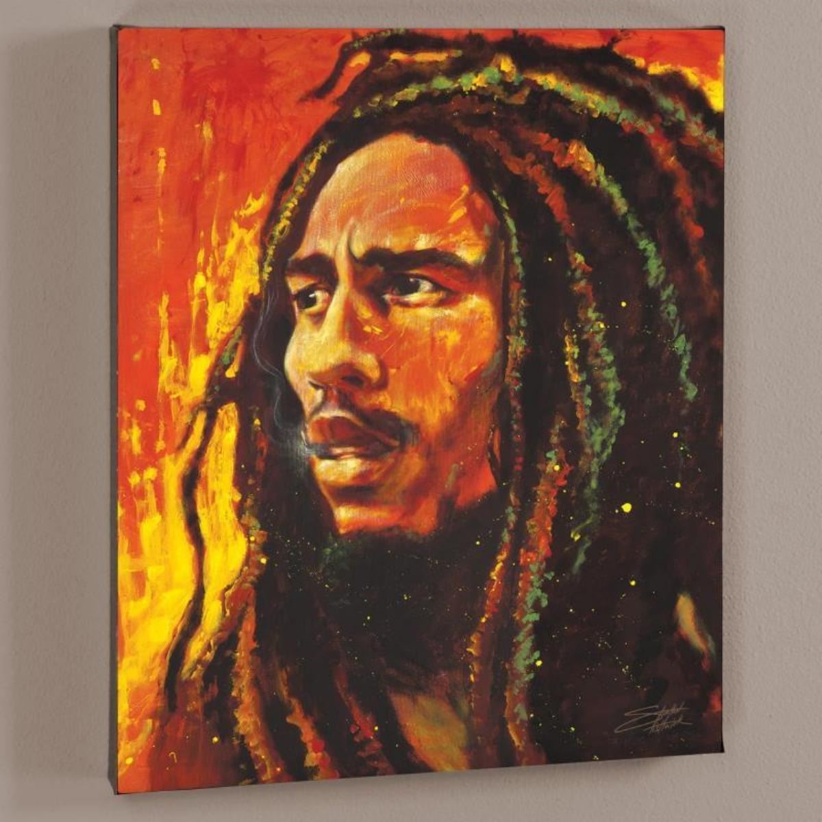 With bright colors and expressive lines, Stephen Fishwick puts a unique spin on pop culture portraits. "Bob Marley" is a limited edition giclee on stretched canvas, numbered and bears the artist's authorized signature. This piece comes gallery wrapped! Includes Letter of Authenticity. Measures approx. 16" x 20" (image).