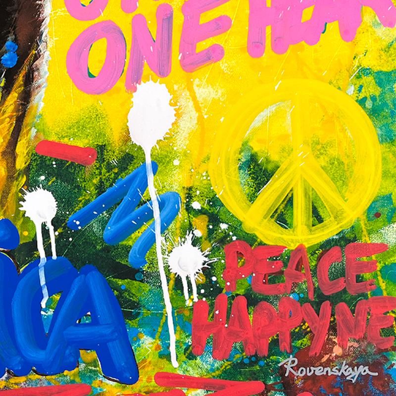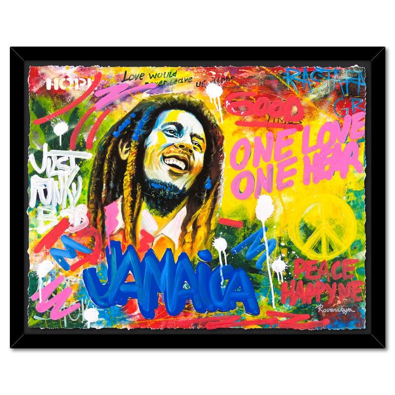"Bob Marley" is a one-of-a-kind mixed media on deckle edge paper by Nastya Rovenskaya; hand signed by the artist. This piece comes custom framed and includes letter of authenticity. Measures approximately 30" x 36.5" (framed), 24" x 30.5" (image).
