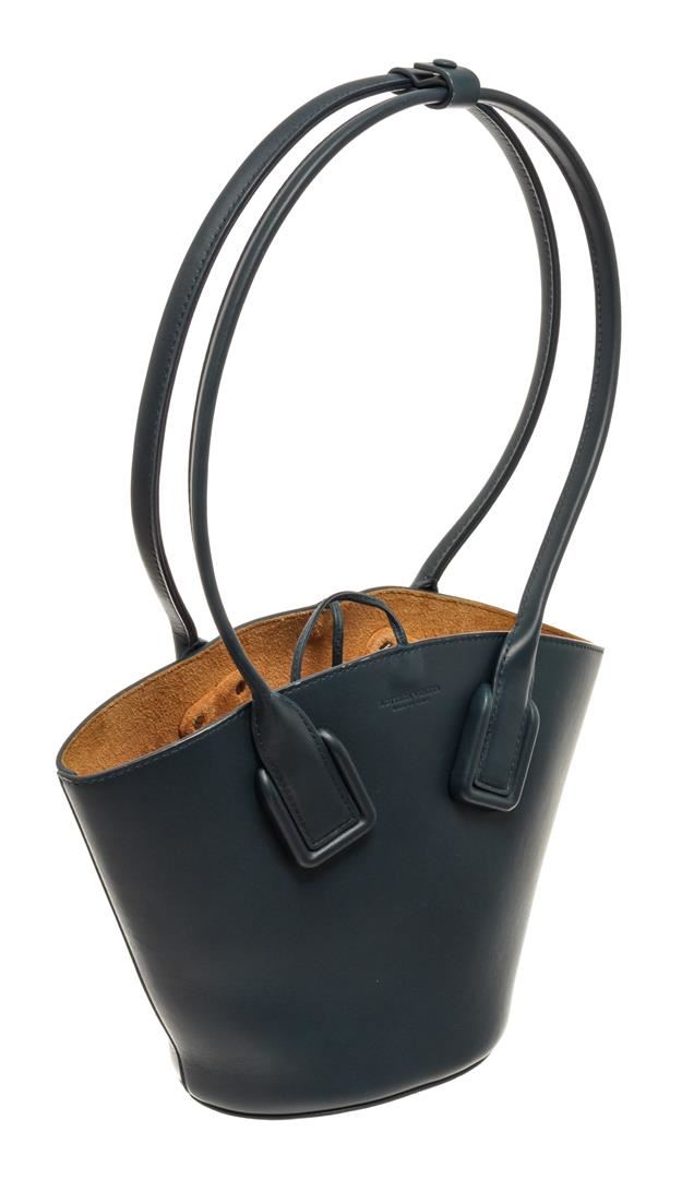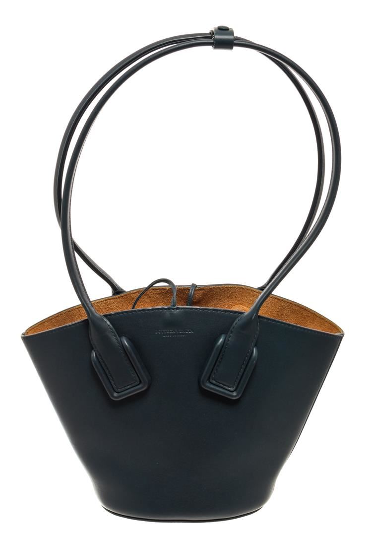 One Bottega Veneta Blue Leather Basket Tote. Item is sold AS-IS. All available information is listed in the description and shown in the photo. Bottega Veneta Blue Leather Basket Tote with silver tone hardware, blue leather trim, tan suede lining, dual top handles, features a removable zipper pouch, and a open top closure.