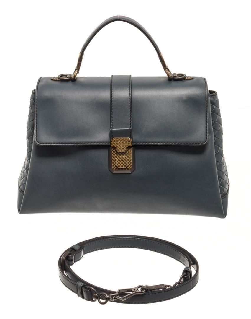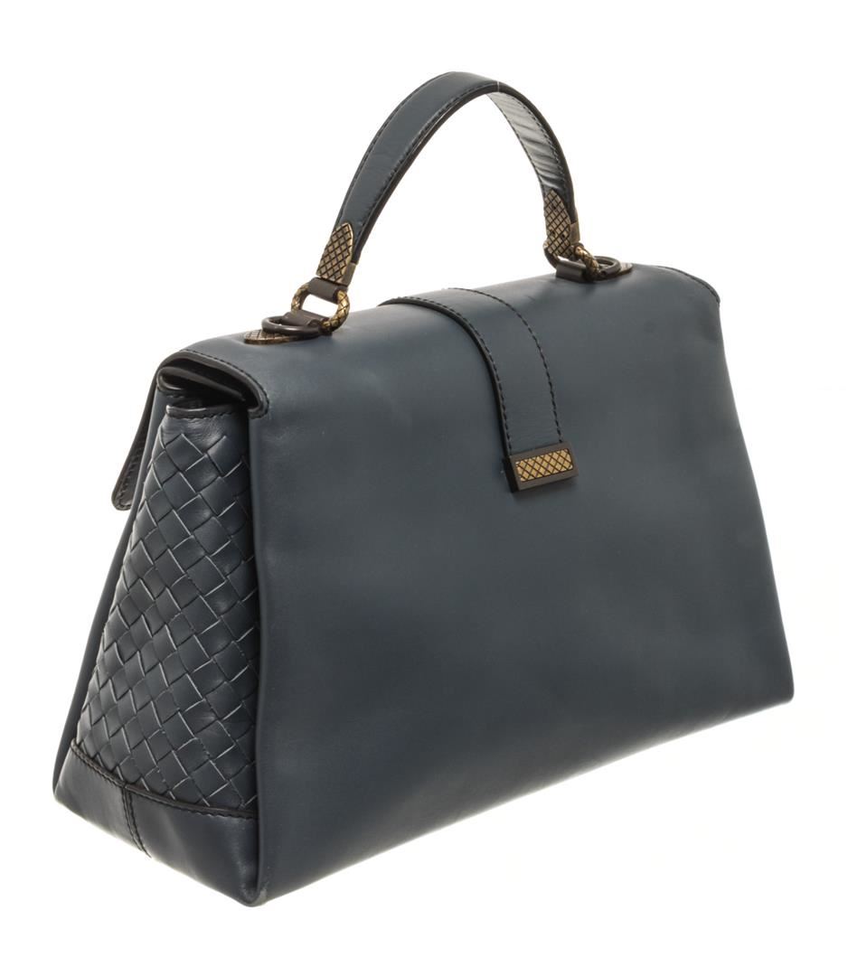Bottega Veneta Blue Leather Piazza Top Handle Bag. All available information is listed in the description and shown in the photos. Bottega Veneta Blue Leather Piazza Top Handle Bag with top handle, detachable strap, suede lining, zip and slip interior pocket, snap closure. Height: 7.5 in (19.05 cm), Width: 12 in (30.48 cm), Depth: 5.5 in (13.97 cm)