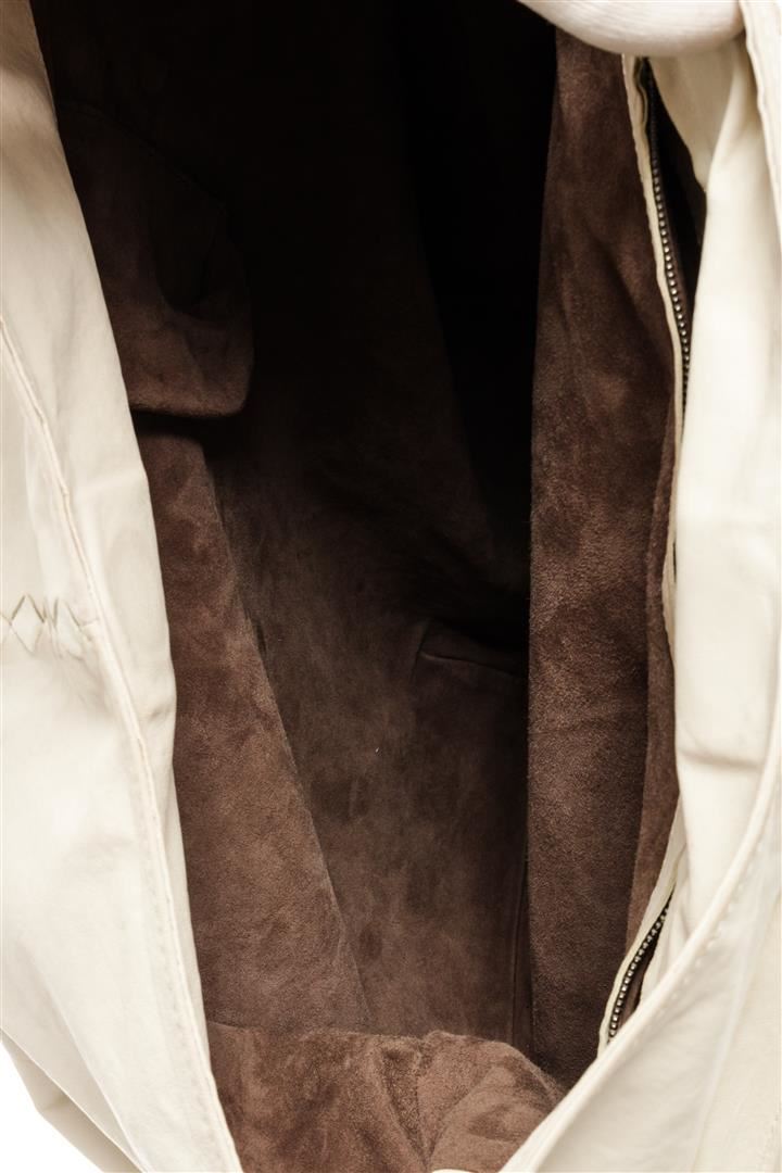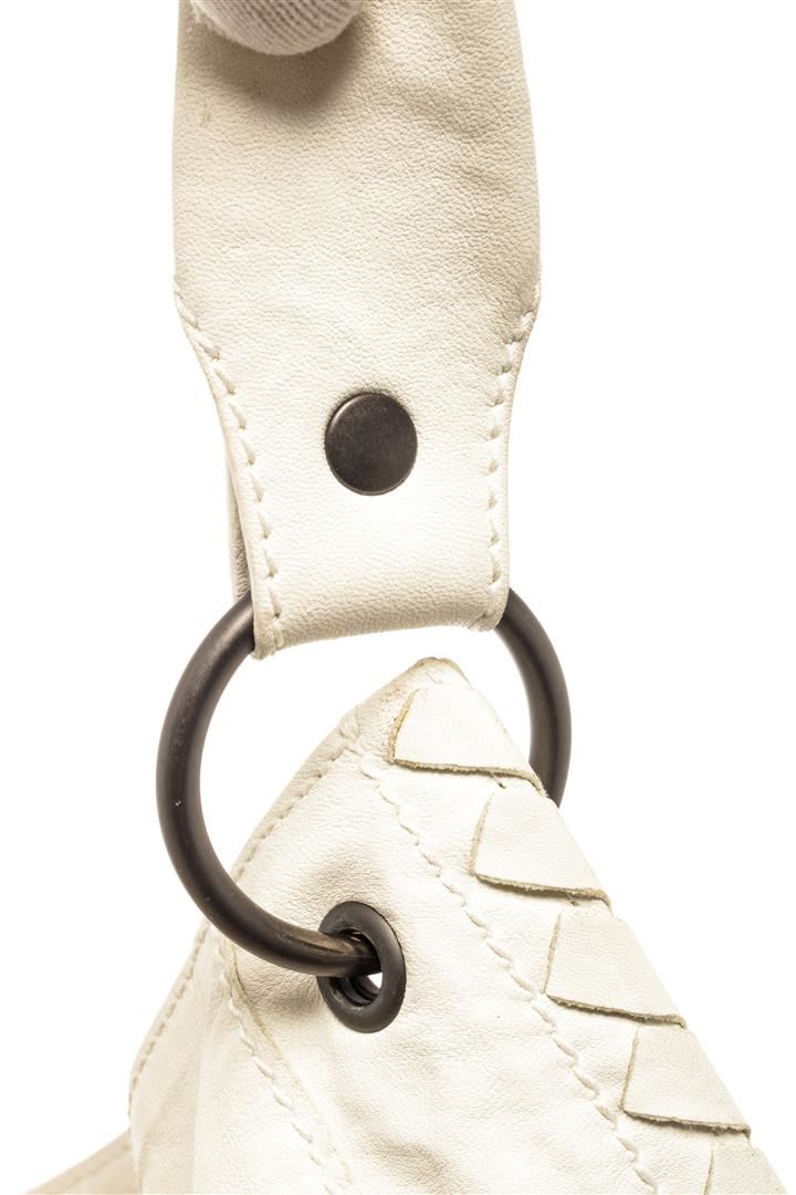 One Bottega Veneta White Leather Hobo Bag. Item is sold AS-IS. All available information is listed in the description and shown in the photo. Bottega Veneta White Leather Hobo Bag features silver-toned hardware, intrecciato weave exterior, brown suede lining, with dual interior pockets, rolled handle and an open top.