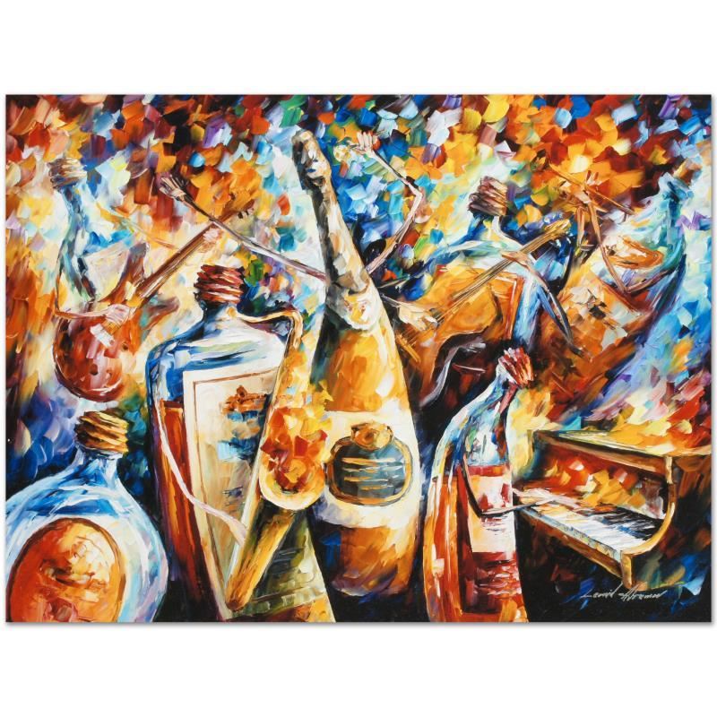 Leonid Afremov's (1955-2019) masterful use of color and texture make his paintings unique collectibles that are sure to brighten any wall. "Bottle Jazz IV" is a limited edition giclee on canvas. The piece is numbered and bears the artist's authorized signature. This piece comes gallery wrapped. Includes Letter of Authenticity. Measures approx. 18" x 24" (image).