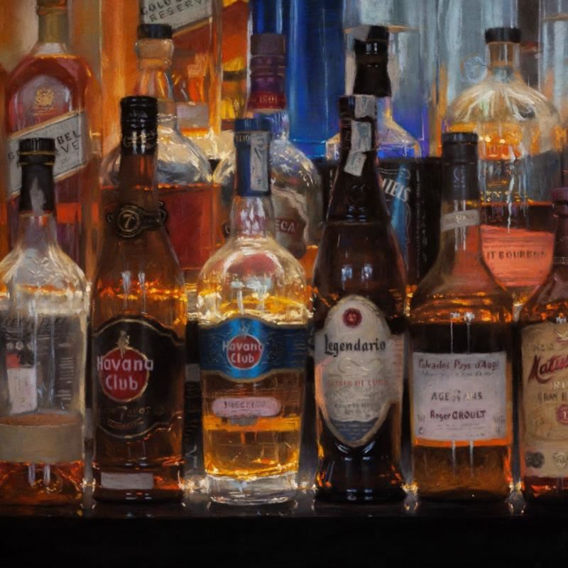 "Bottles the Illuminate the Night" is a limited edition giclee on canvas by Vicente Romero. The piece is hand signed, numbered, and come with a certificate of authenticity. Measures approximately 21.5" x 28".