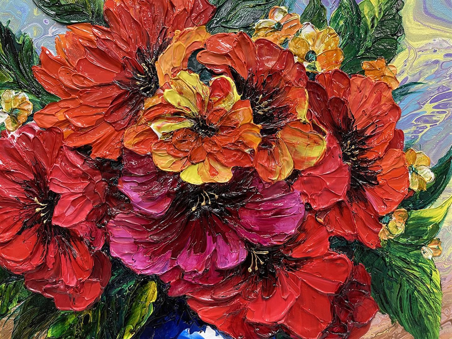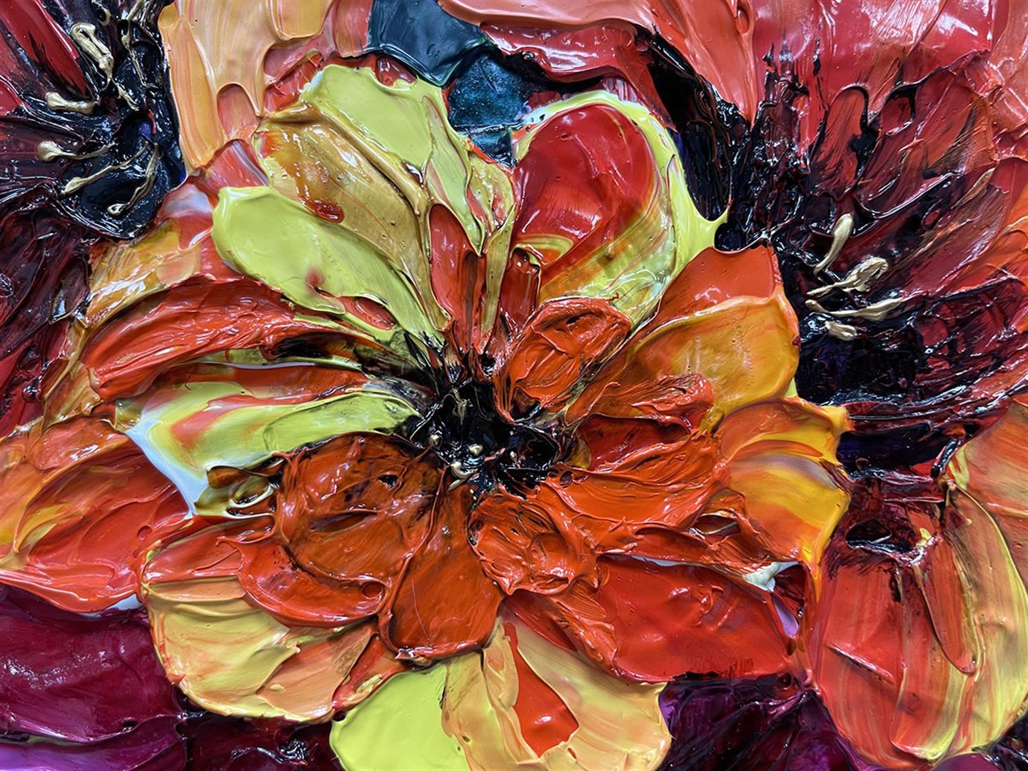 Brilliant original acrylic on canvas. Hand signed by artist. This artwork comes gallery wrapped. Approximately 20x20 inches