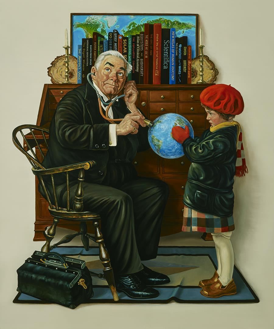 "Doctor and Earth" a 36x30" giclee on canvas by Charles Lynn Bragg uses Norman Rockwell's charming image to remind us that our planet needs loving care, attention and regular checkups.