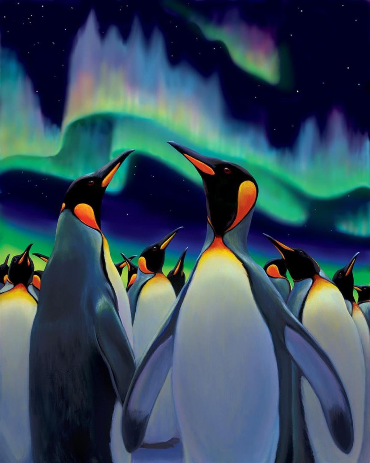"Penguin Light Show", by Charles Lynn Bragg, is a 24x20 giclee on canvas, featuring Emperor Penguins enjoying the "aroura borealis" and admiring how it adds lusterous color to their tuxedos. With Artist signed COA.