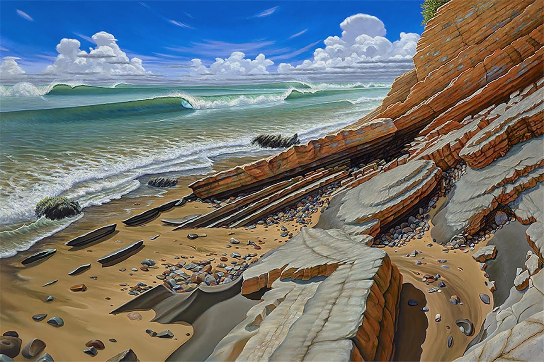 "Refugio Beach" is a 40x60" original oil on canvas taking us to one of Mr.Bragg's favorite surfing spots along the Pacific Coast near Santa Barbara. With signature on the back (only), it is stretched, and comes with the Artist's COA.