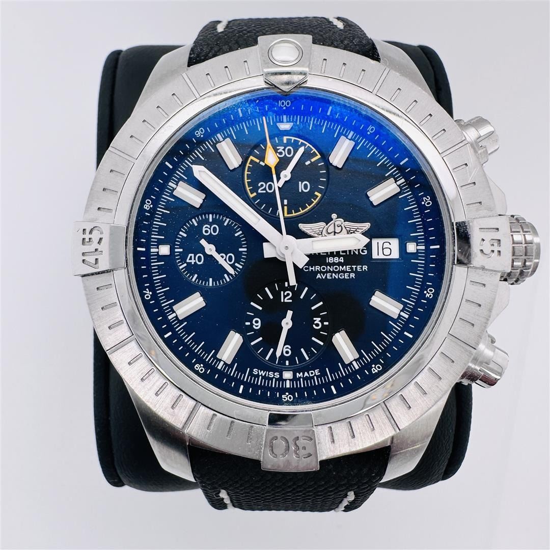 One Breitling Avenger Stainless Steel Chronograph Black Dial Wristwatch. This watch is in excellent condition. The watch photographed is the actual watch.