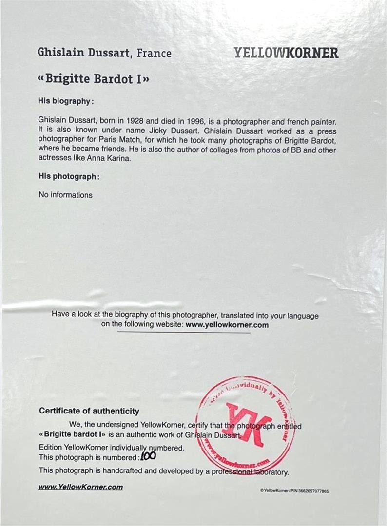 Brigitte Bardot I Ghaslain Dussart Famous Actress YellowKorner Certified Photograph. Certificate of Authenticity from YellowKorner affixed to the back. Matted Dimensions 16"x20". Protected with Clear Mylar Sleeve.