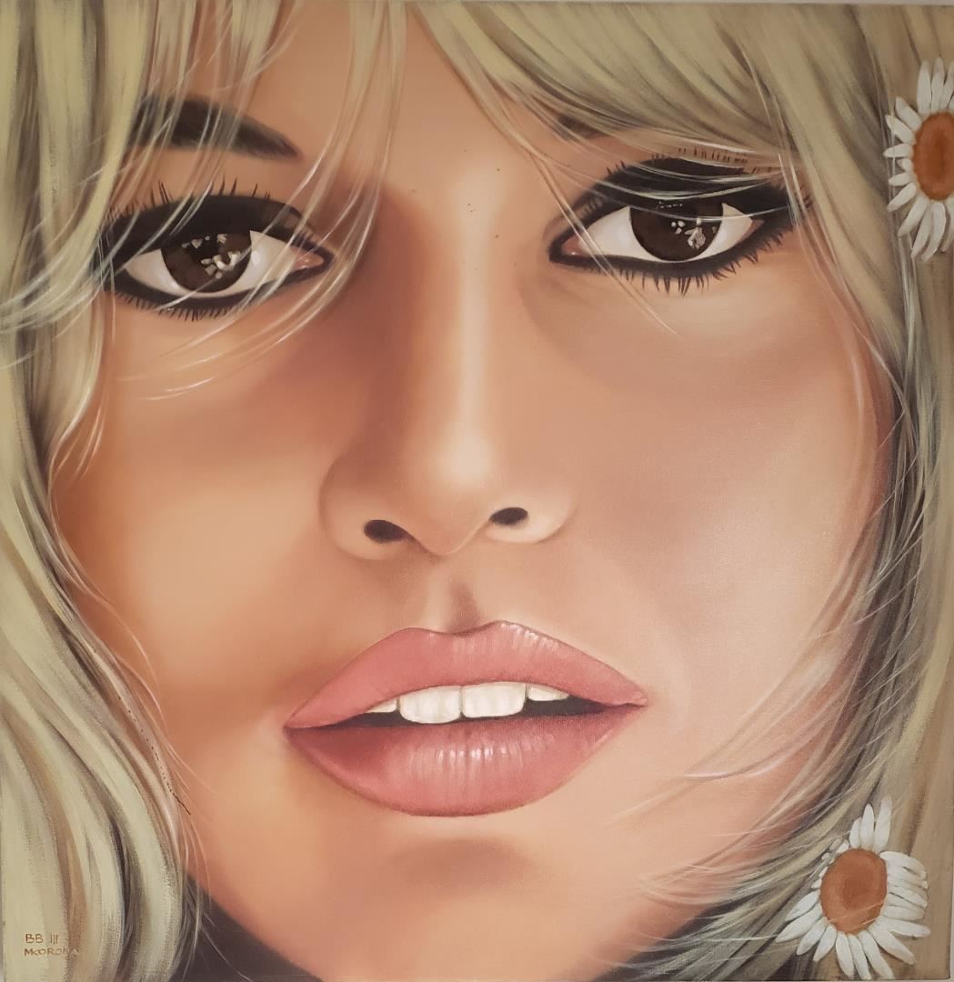 An original 30x30" oil painting of Brigitte Bardot by Margaret Korona on stretched canvas, signed by Artist ; with COA by Artist