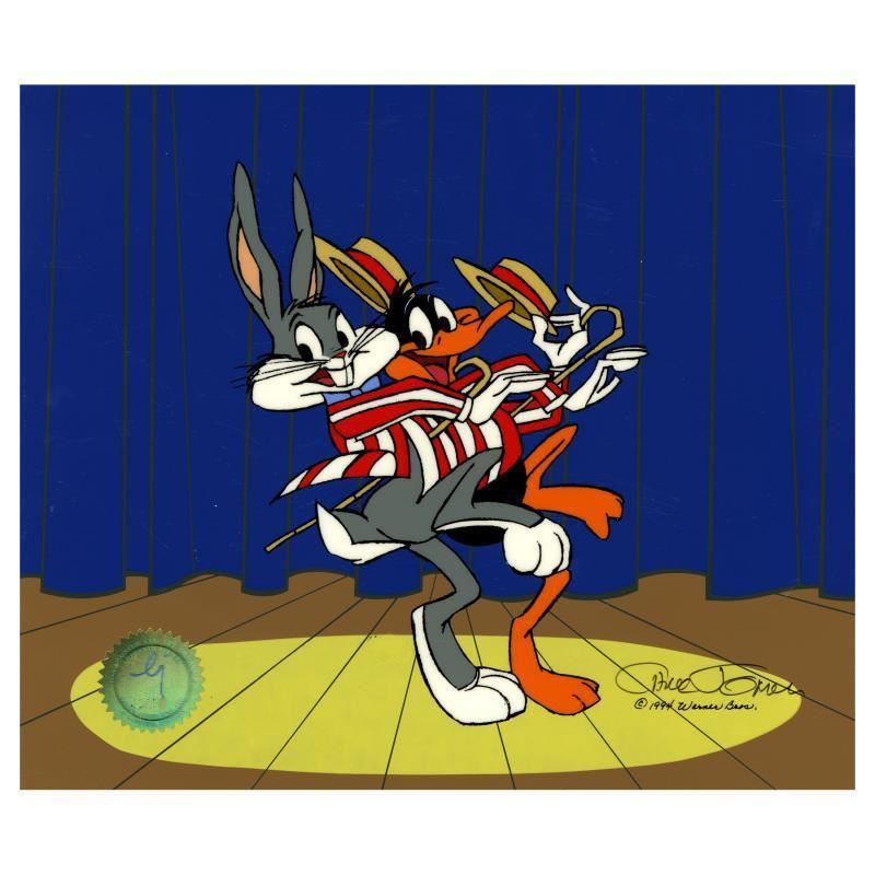 Bugs And Daffy: Curtain Call is a limited edition animation cel with hand painted coloring on sericel outline. The piece is numbered, hand signed by Chuck Jones (1912-2002), and includes a Certificate of Authenticity! Measures Approx: 12.5 x 10.5