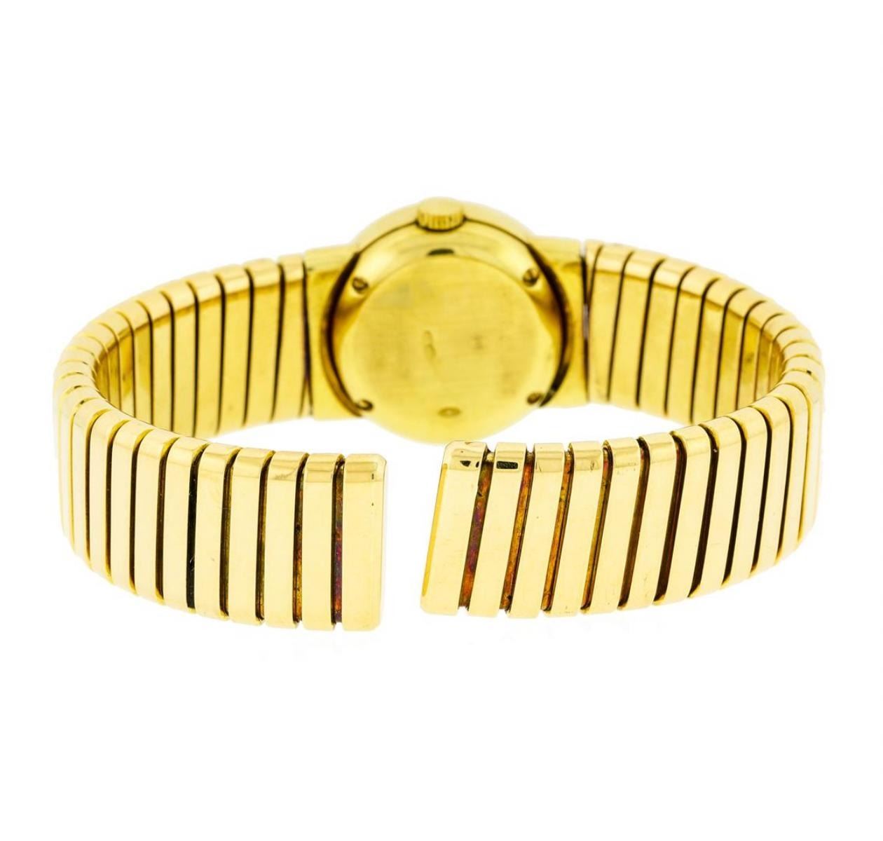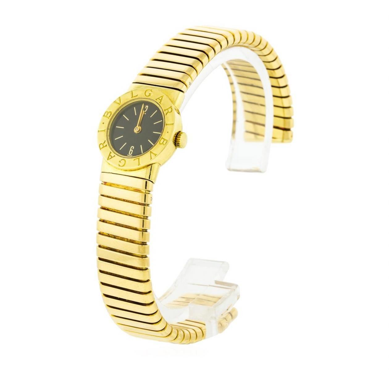 One, Bvlgari Tubogas wristwatch electronically tested, 18KT yellow gold Case: 19mm diameter, French Hallmarked Case Back: engraved with the manufacturers name, ID numbers, and an additional hallmark, Bezel: engraved BVLGARI BVLGARI, Crystal: synthetic sapphire. Movement: Swiss quartz, Dial: Black, with baton pointed hands, indices and two numerals, Bvlgari Cuff Bracelet: flexible, 18KT yellow gold, Condition: G-6 Extra Fine. Six inch length. Total Weight of Watch 67.74gm. AIG Appraised.
