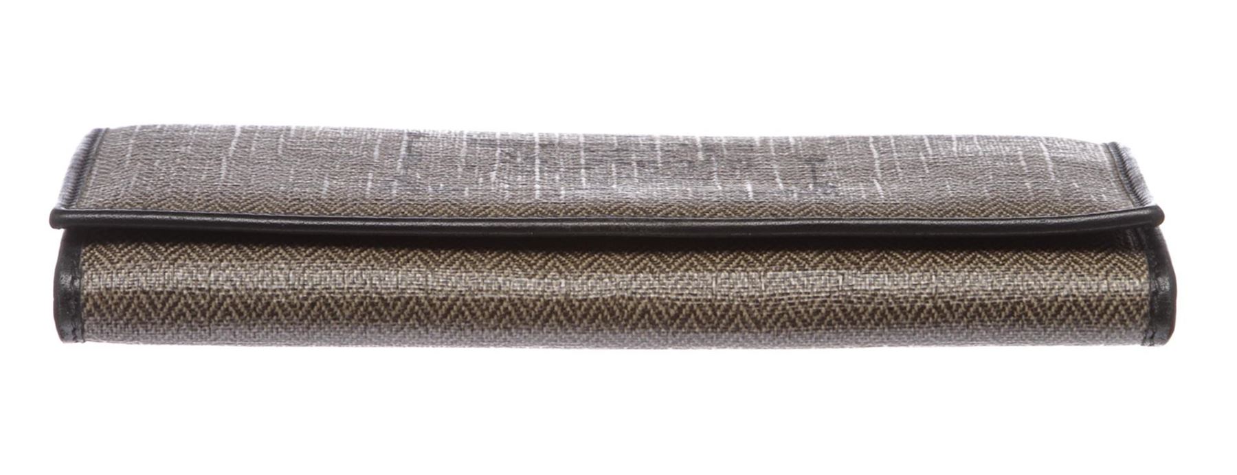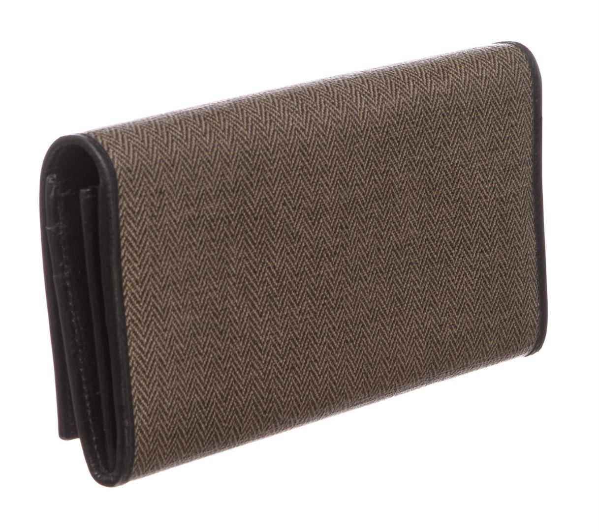 Overall flap snap closure. Interior is leather lined with ten credit card slip pockets, two compartments with zipper pocket partition and one billfold slip pocket.