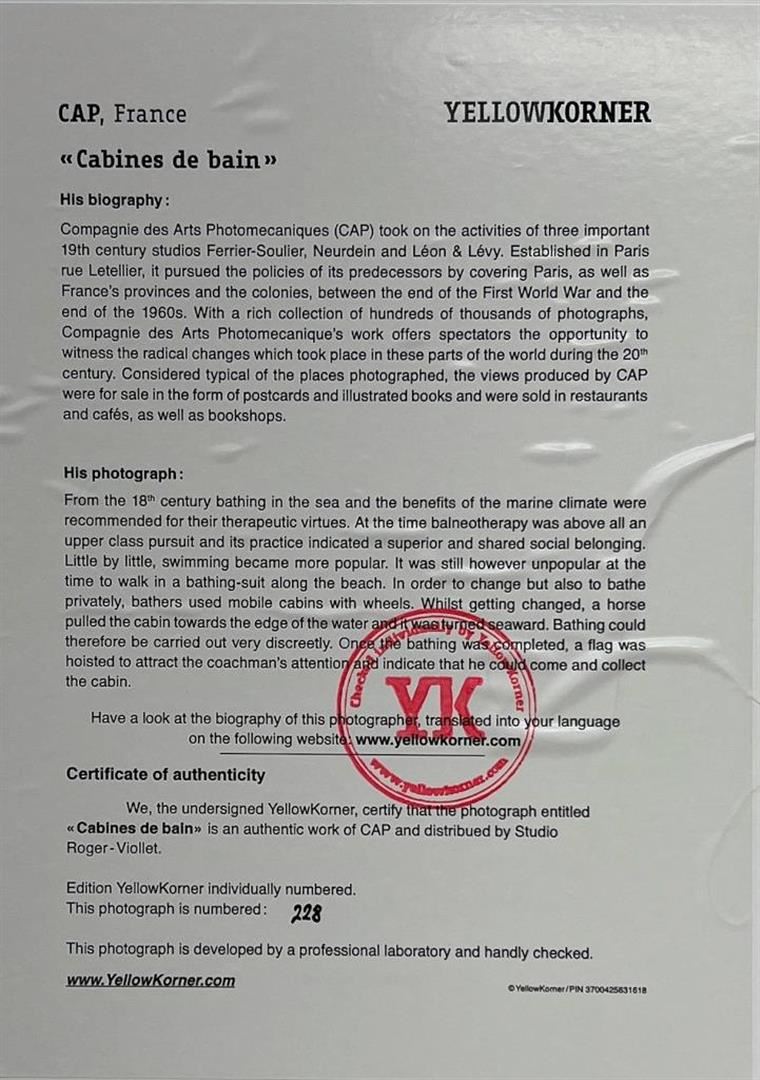 CAP France Cabines de Bain YellowKorner Certified Photograph. Certificate of Authenticity from YellowKorner affixed to the back. Matted Dimensions 16"x20". Protected with Clear Mylar Sleeve.