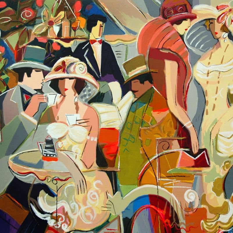 "Cafe Romantique" is a limited edition serigraph on paper by Isaac Maimon, numbered and hand signed by the artist. Includes Letter of Authenticity. Measures approx. 41" x 27.5" (border), 38" x 24" (image).
