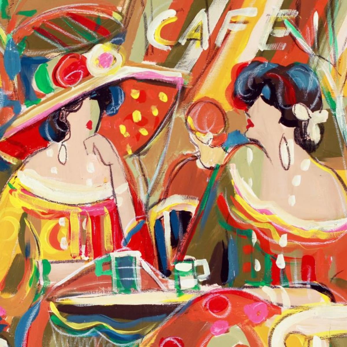"Cafe Shop" is an original acrylic painting on paper by Isaac Maimon, hand signed by the artist. Includes Certificate of Authenticity. Measures approx. 22" x 22" (image).