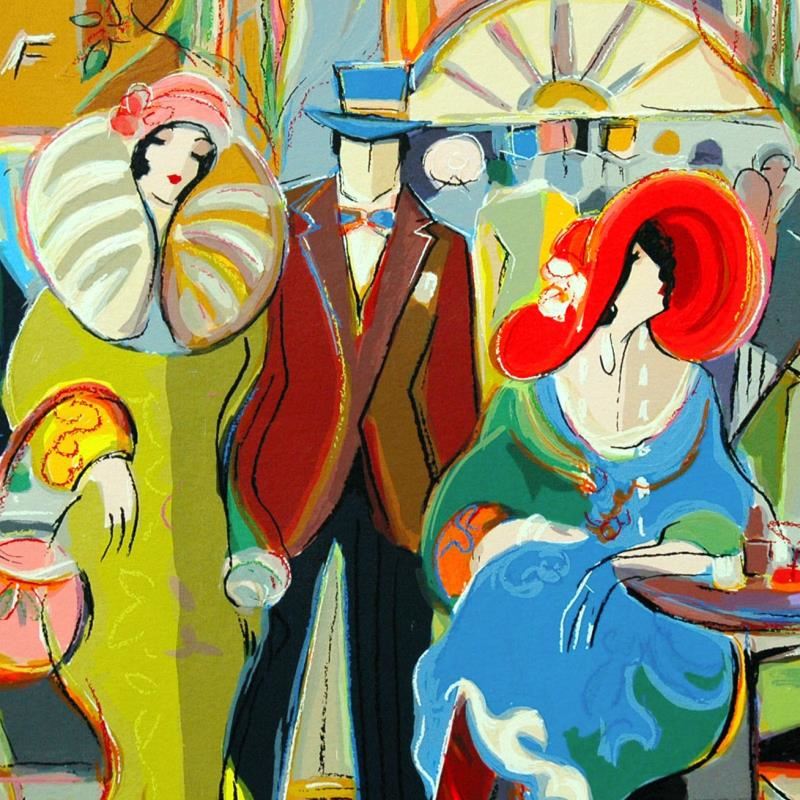 "Cafe Society" is a limited edition serigraph on paper by Isaac Maimon, numbered and hand signed by the artist. Includes Letter of Authenticity. Measures approx. 24" x 19" (border), 20.5" x 16" (image).