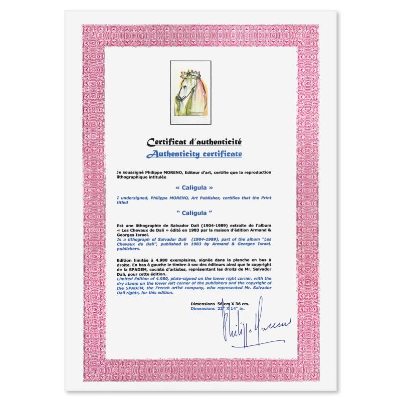 "Caligula" is a limited edition lithograph by Salvador Dali (1904-1989), bearing the plate signature of the artist. This piece was published by Armand & Georges Israel in 1983 during Dali's lifetime and under his supervision. This piece was printed on Velin D'arches paper in Paris. This work is referenced in The Official Catalog of the Graphic Works of Salvador Dali (Albert Fields). This piece comes custom framed. Includes Certificate of Authenticity. Measures approx. 20" x 28" (frame), 14" x 22" (image).