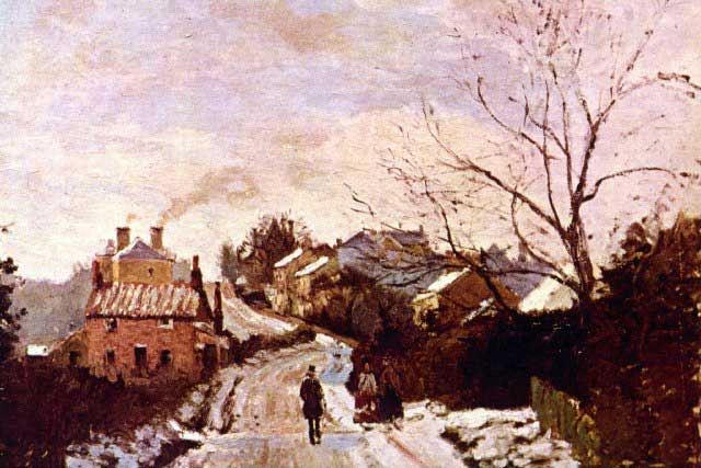 Artist : Camille Pissarro - Title: Neige a Lower Norwood - Medium: Fine Art Reproduction Giclee on Canvas - Image Size: Approximately 13.25 inches x 20 inches - Unframed on Unstretched Canvas - Biography: Camille Pissarro was a Danish-French Impressionist and Neo-Impressionist painter born on the island of St Thomas. His importance resides in his contributions to both Impressionism and Post-Impressionism. Pissarro studied from great forerunners, including Gustave Courbet and Jean-Baptiste-Camille Corot.