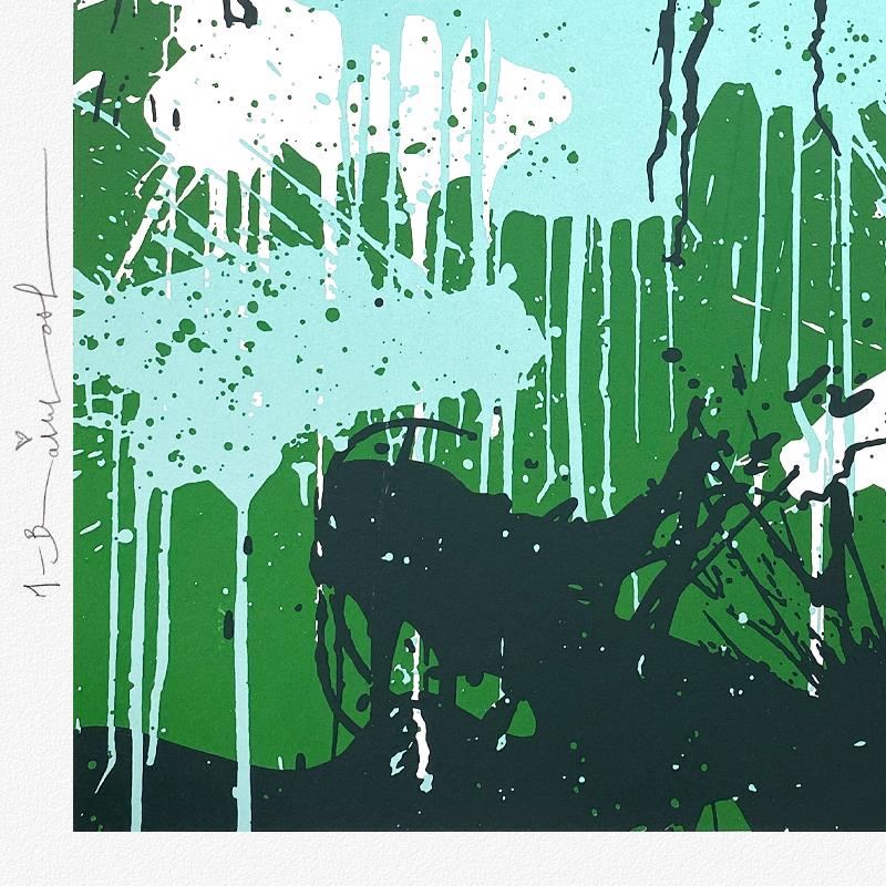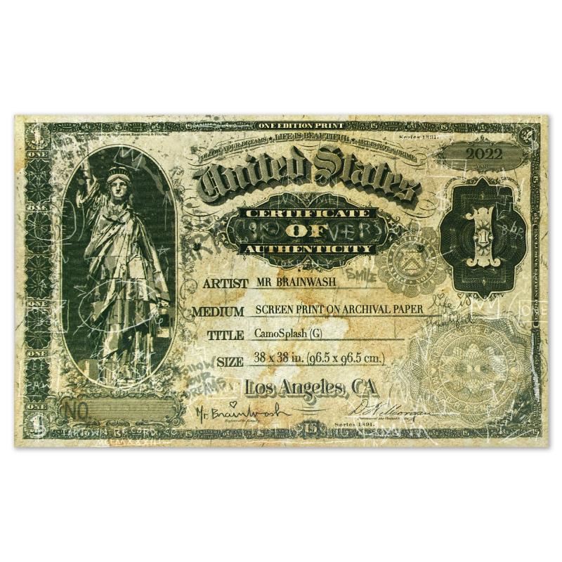 "Camo Splash G" is a limited edition silk screen print on paper by Mr Brainwash, hand signed and thumb-printed by the artist. The piece comes custom framed with a Certificate of Authenticity. Measures approx. 42" x 42" (framed), 38" x 38" (image). This item requires special handling and may have a longer than usual turnaround.