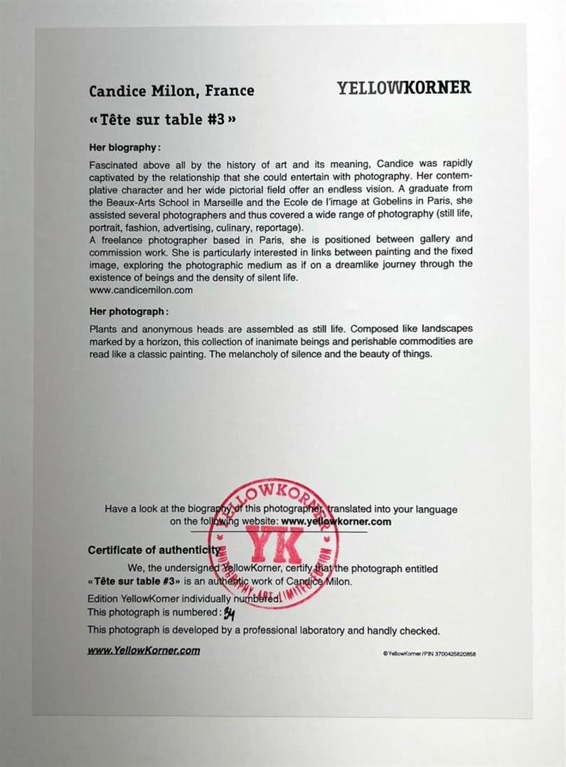 Candice Milon france tete Sur Table #3 Still Lilfe YellowKorner Certified Photograph. Certificate of Authenticity from YellowKorner affixed to the back. Matted Dimensions 16"x20". Protected with Clear Mylar Sleeve.