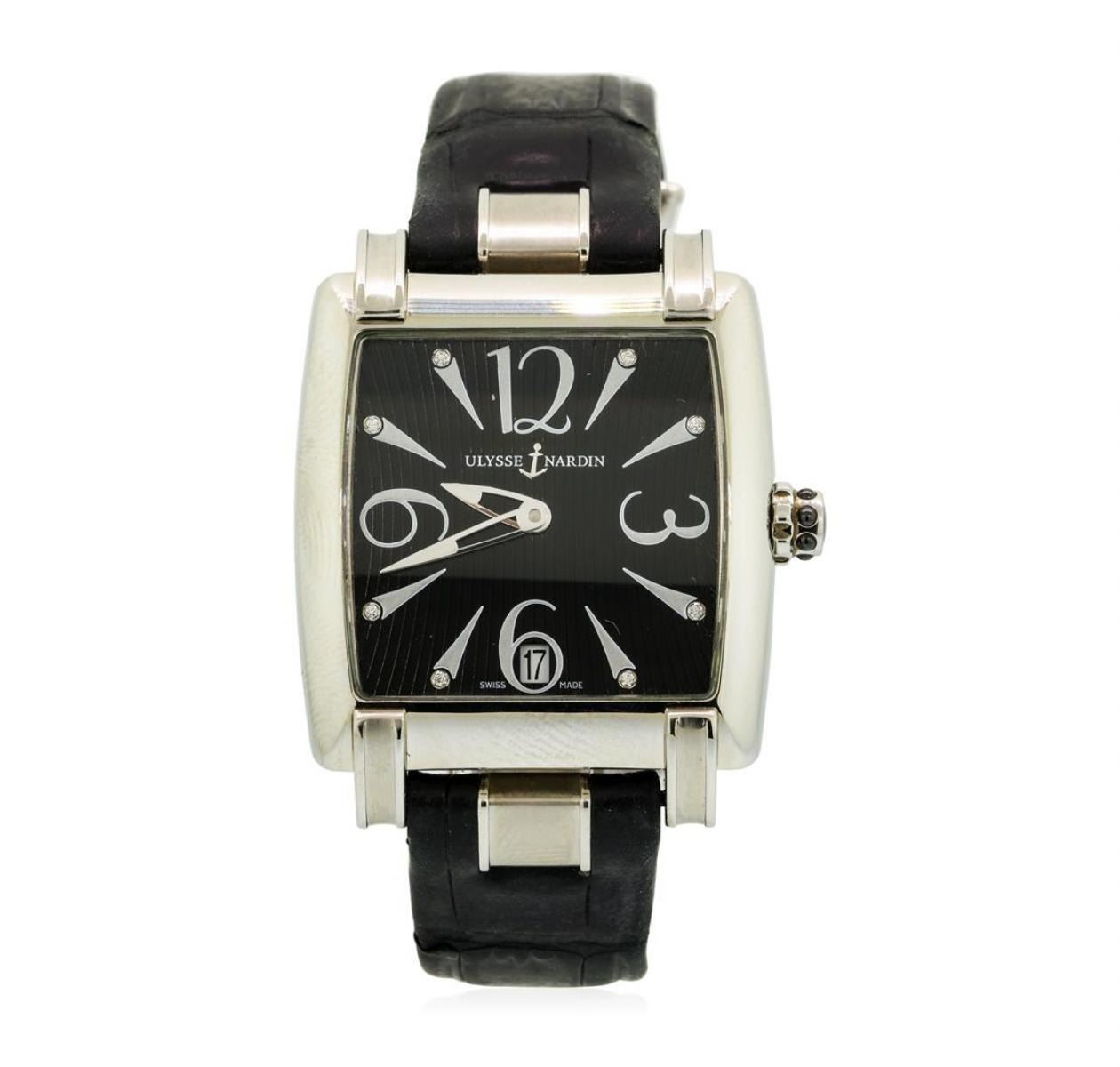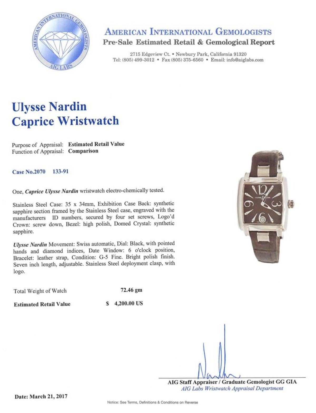 One, Caprice Ulysse Nardin wristwatch electro-chemically tested.Stainless Steel Case: 35 x 34mm, Exhibition Case Back: synthetic sapphire section framed by the Stainless Steel case, engraved with the manufacturers ID numbers, secured by four set screws, Logo'd Crown: screw down, Bezel: high polish, Domed Crystal: synthetic sapphire.Ulysse Nardin Movement: Swiss automatic, Dial: Black, with pointed hands and diamond indices, Date Window: 6 o'clock position, Bracelet: leather strap, Condition: G-5 Fine. Bright polish finish. Seven inch length, adjustable. Stainless Steel deployment clasp, with logo. Total Weight of Watch 72.46gm. AIG Appraised.