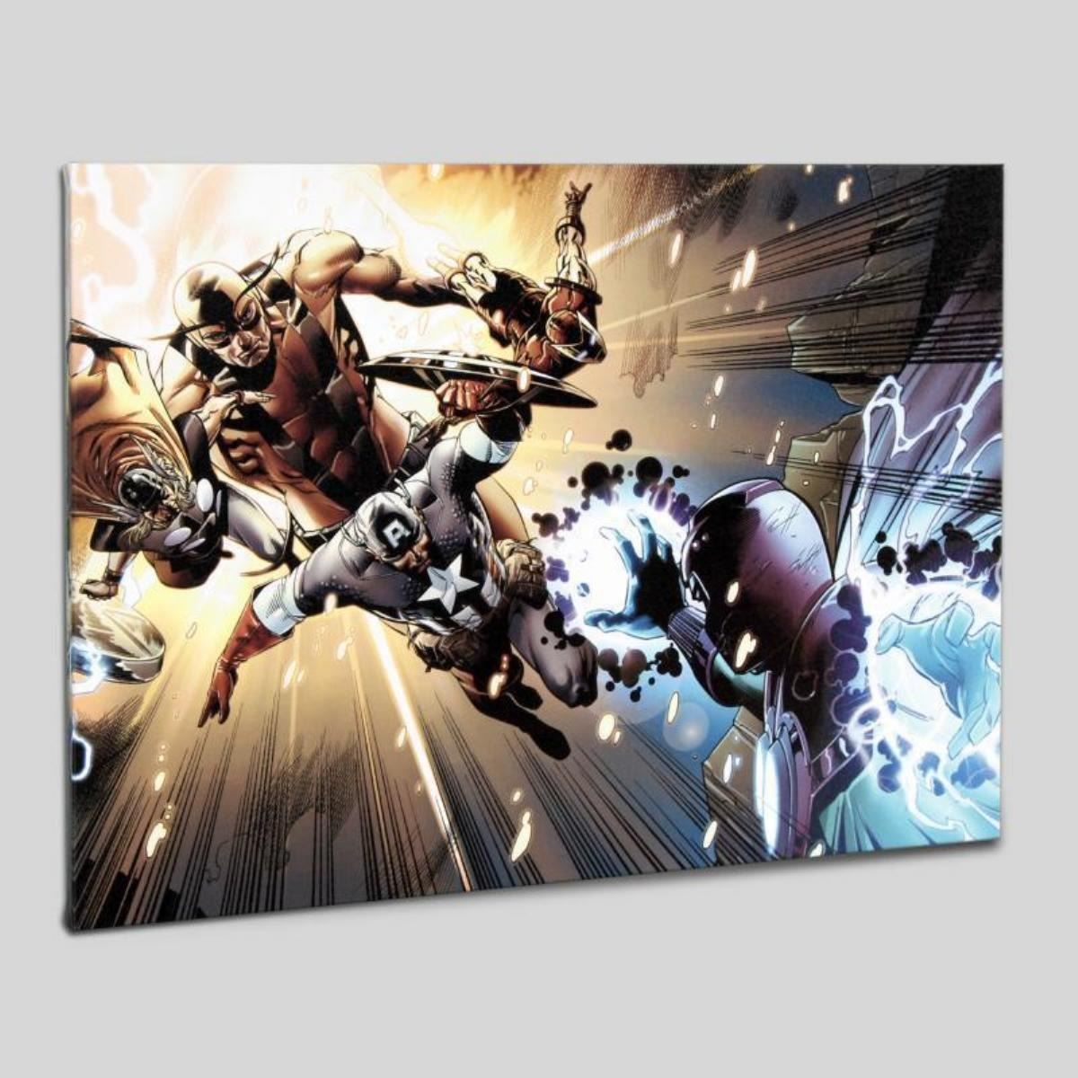 A piece of comic book history, this limited edition, from original art by Bryan Hitch, depicts the heroic Captain America. British artist Bryan Hitch was inspired by comic books at an early age. Not only has Hitch worked on the The Avengers, Captain America, and She-Hulk, but he also did the character design for the Ultimate Avengers and Ultimate Avengers 2 animated films. "Captain America: Man Out Of Time #5" is a limited edition numbered giclee on stretched canvas by Bryan Hitch presented by Marvel Comics. This piece comes gallery wrapped. Includes Certificate of Authenticity! Measures approx. 24" x 18" (image); 1.5" (depth).
