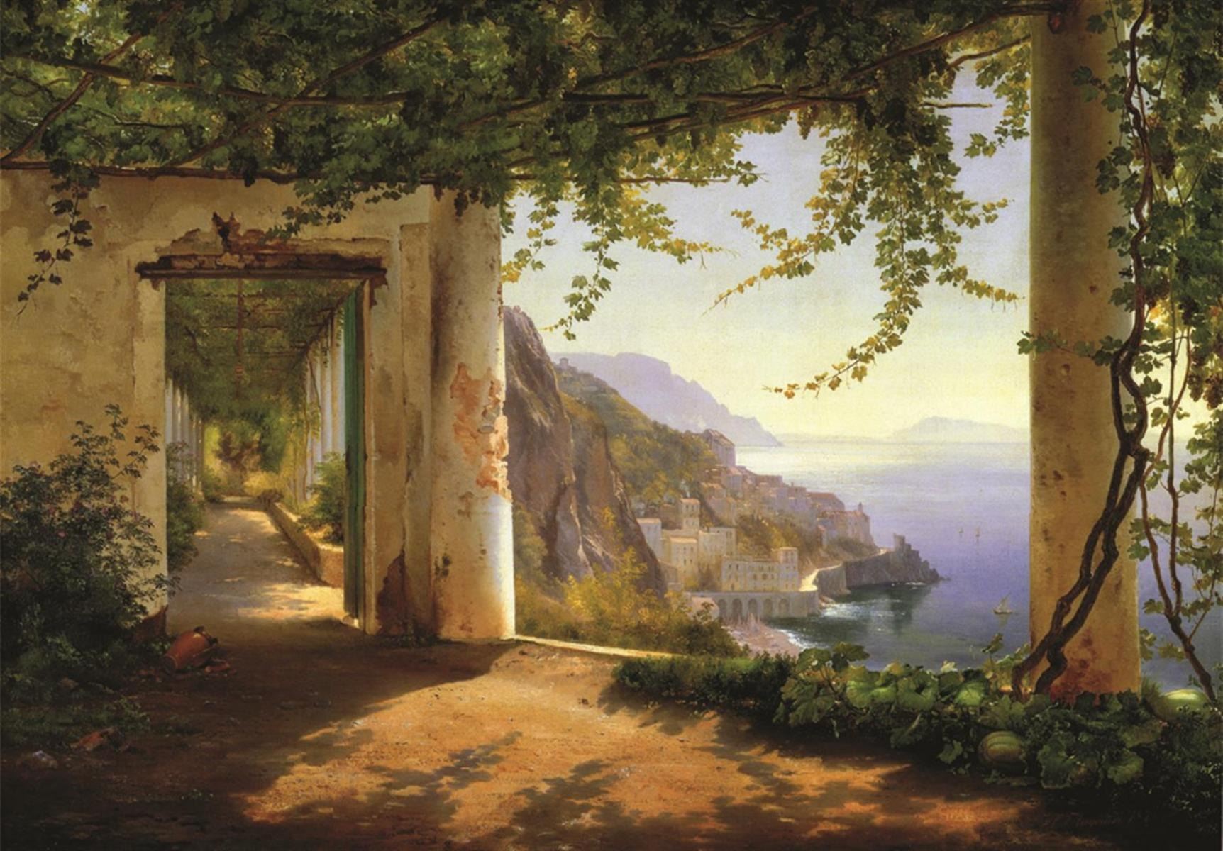 Artist: Carl Aagaard - Title: View Of Amalfi Coast - Medium: Fine Art Giclee on Canvas - Image Size: Approximately 22.25 inches x 32 inches - Framed: Unframed on Unstretched Canvas - Carl Frederik Peder Aagaard was a Danish landscape painter. Working in a classical academic style, he focused on Northern European forests and waterways. Aagaard's work is especially notable for his inclusion of historical architecture and ruins, which he often located in epic and romantic milieu.