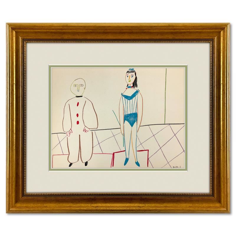 La Comedie Humaine 30.1.54-I is a vintage lithograph on paper by Pablo Picasso (1881-1973). This piece comes framed. Includes Letter of Authenticity. Measures approx. 18 x 21 (frame), 10 x 13 (image).