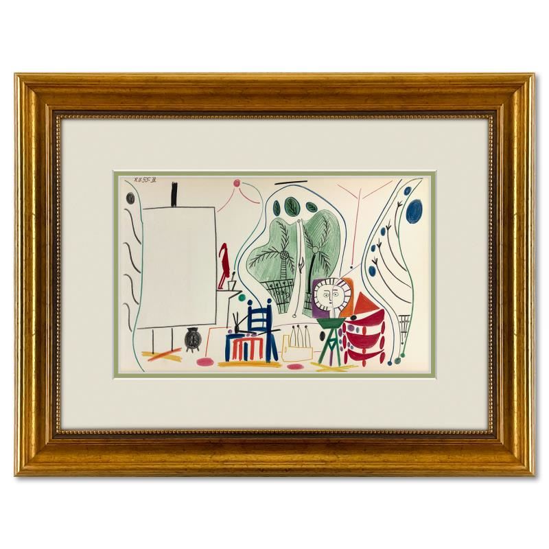 "Carnet de Californie 8.11.55-III" is a vintage lithograph on paper by Pablo Picasso (1881-1973). This piece is from Picasso's Carnet de Californie Series and was printed in Paris, France by Mourlot Studios in 1959. This piece comes framed. Includes Letter of Authenticity. Measures approx. 18.5" x 24.5" (frame), 10.5" x 16.5" (image).