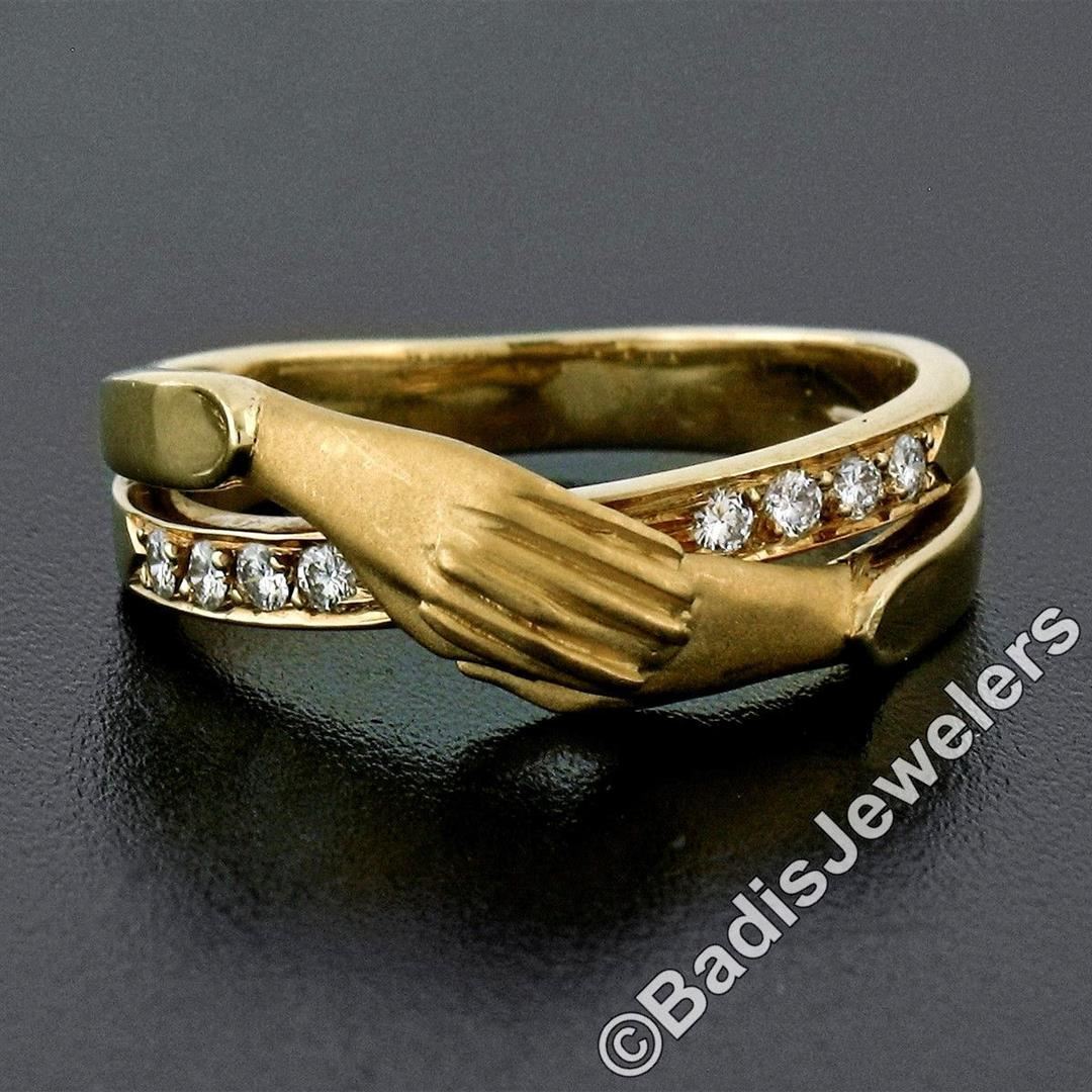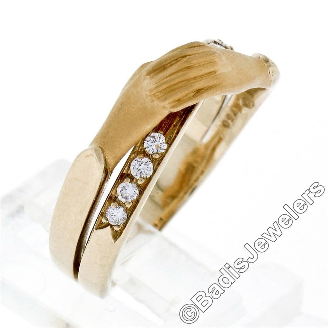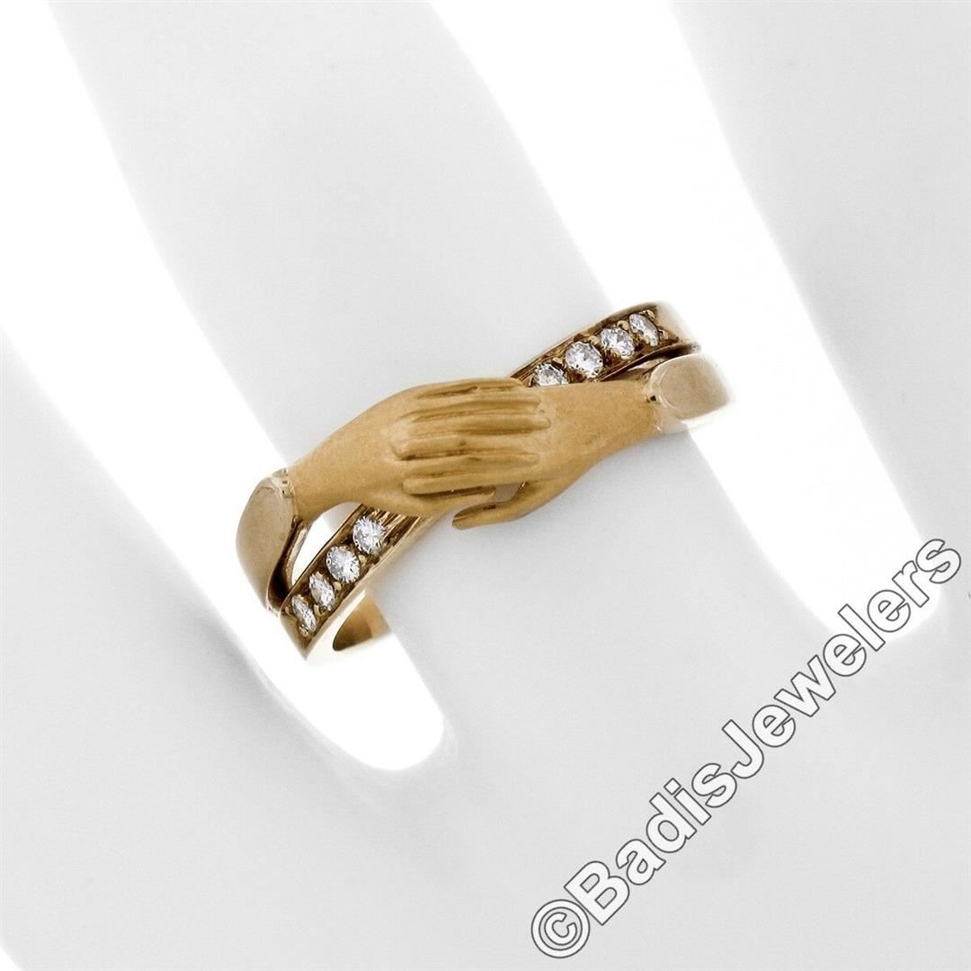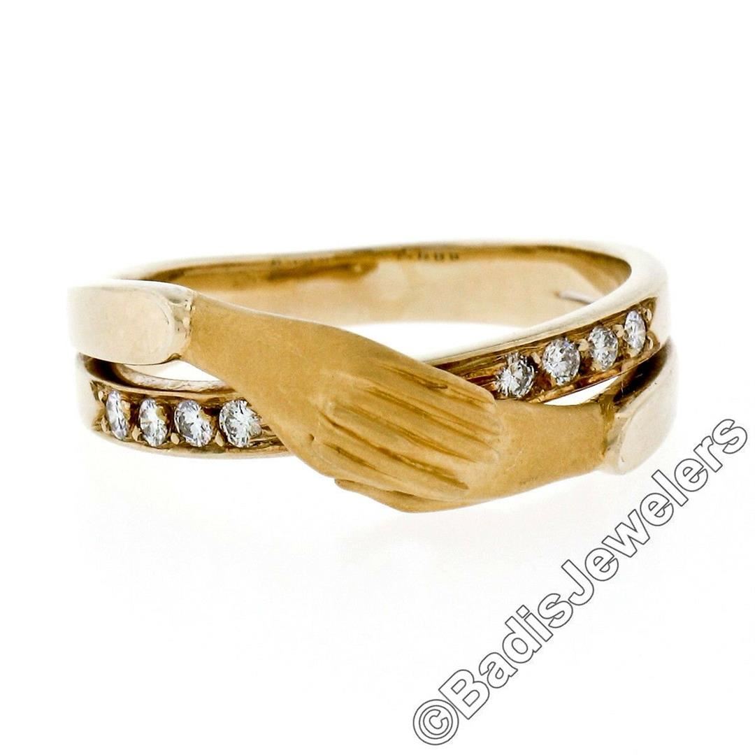 An 18kt yellow gold band ring made by Carrera y Carrera featuring folded hands and 0.16ctw of round brilliant diamonds (E/F - VVS1/VVS2). The ring is size 6.0, weighs a total of 4.74 grams, and measures 7.5mm wide.