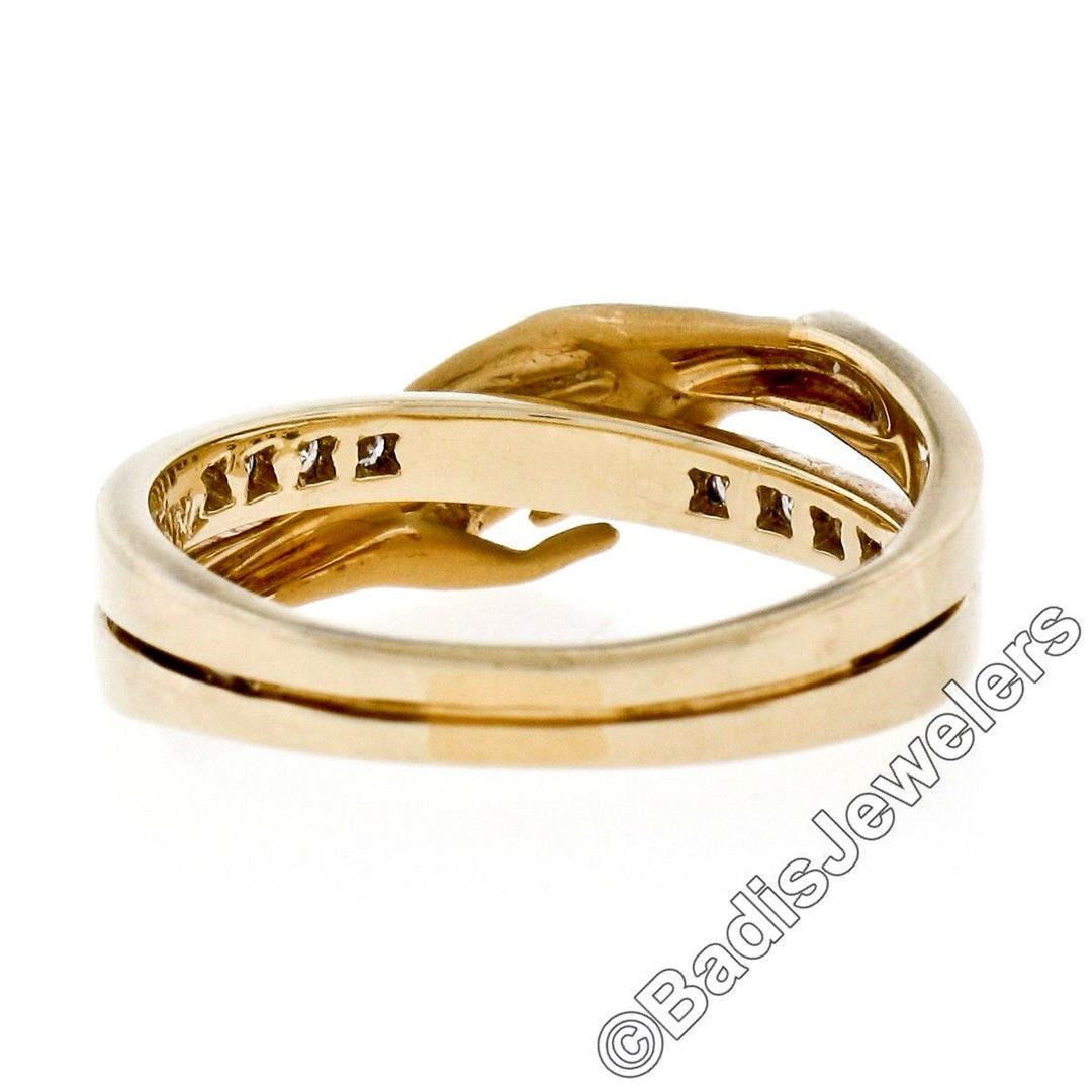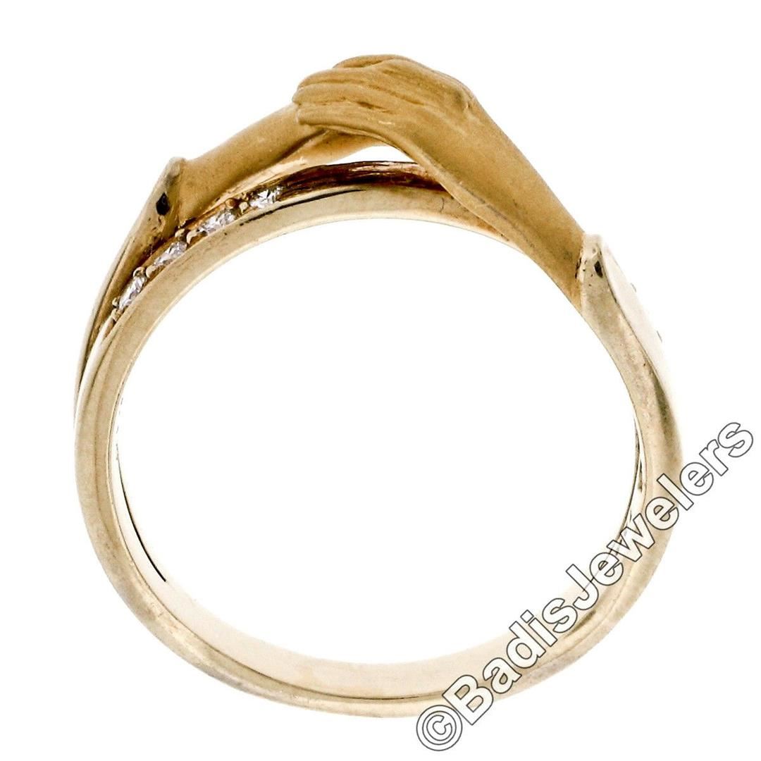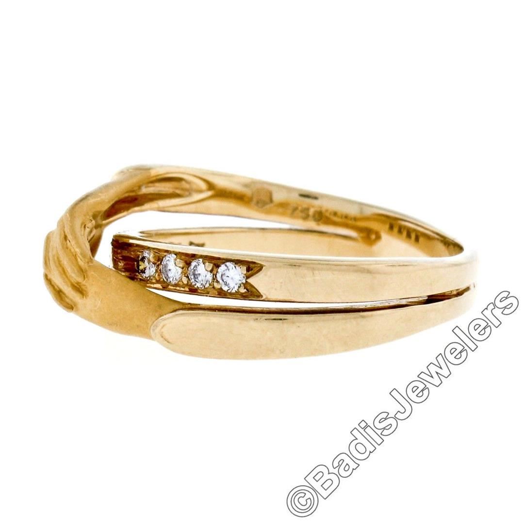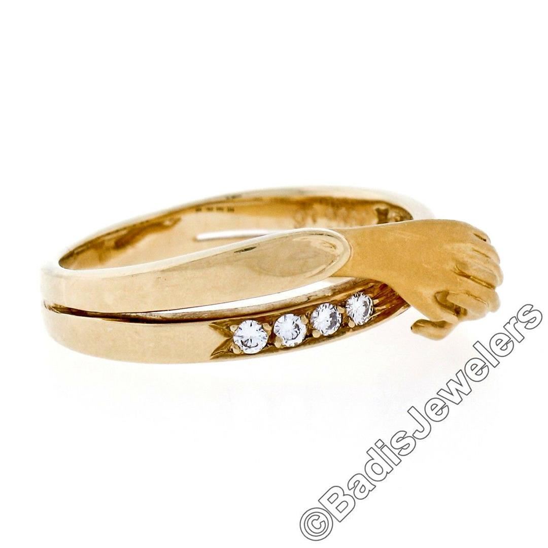 An 18kt yellow gold band ring made by Carrera y Carrera featuring folded hands and 0.16ctw of round brilliant diamonds (E/F - VVS1/VVS2). The ring is size 6.0, weighs a total of 4.74 grams, and measures 7.5mm wide.