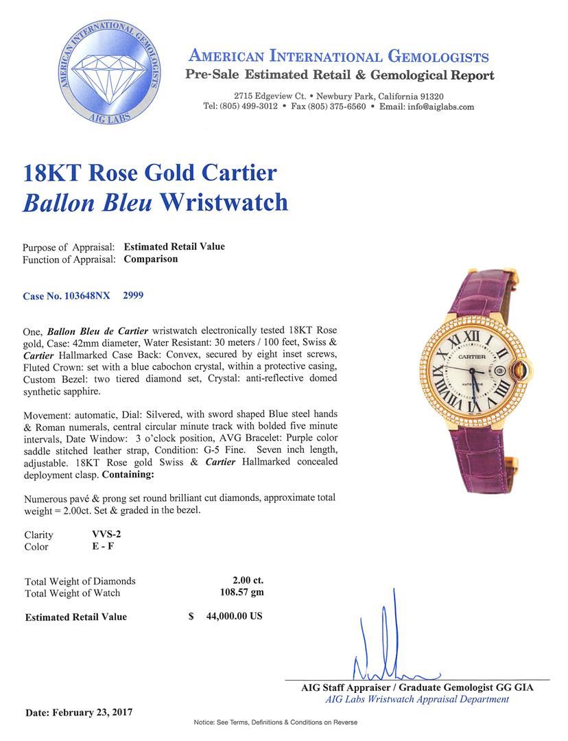 One, Ballon Bleu de Cartier wristwatch electronically tested 18KT rose gold, Case: 42mm diameter, Water Resistant: 30 meters / 100 feet, Swiss & Cartier Hallmarked Case Back: Convex, secured by eight inset screws, Fluted Crown: set with a blue cabochon crystal, within a protective casing, Custom Bezel: two tiered diamond set, Crystal: anti-reflective domed synthetic sapphire.Movement: automatic, Dial: Silvered, with sword shaped Blue steel hands & Roman numerals, central circular minute track with bolded five minute intervals, Date Window: 3 o'clock position, AVG Bracelet: Purple color saddle stitched leather strap, Condition: G-5 Fine. Seven inch length, adjustable. 18KT gold Swiss & Cartier Hallmarked concealed deployment clasp. Containing:Numerous pave� & prong set round brilliant cut diamonds, approximate total weight = 2.00ct. Set & graded in the bezel. Clarity: VVS-2 Color E - F. Total Weight of Diamonds 2.00ct. Total Weight of Watch 108.57gm. AIG Appraised at $44,000.00.