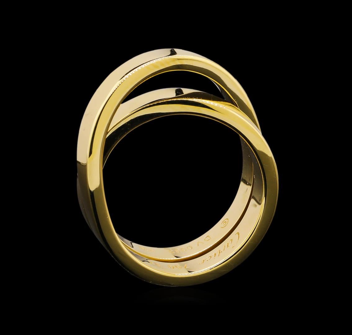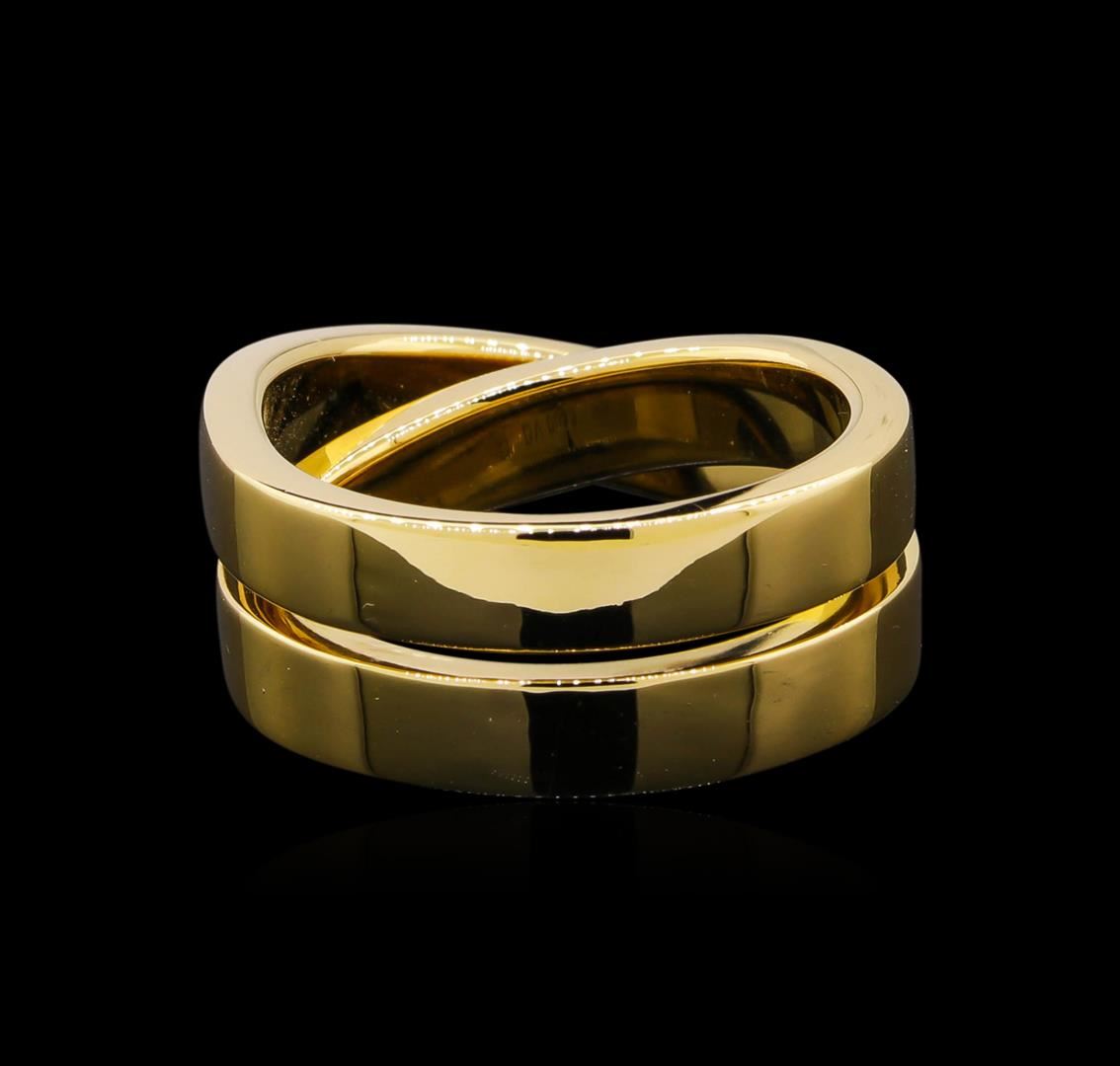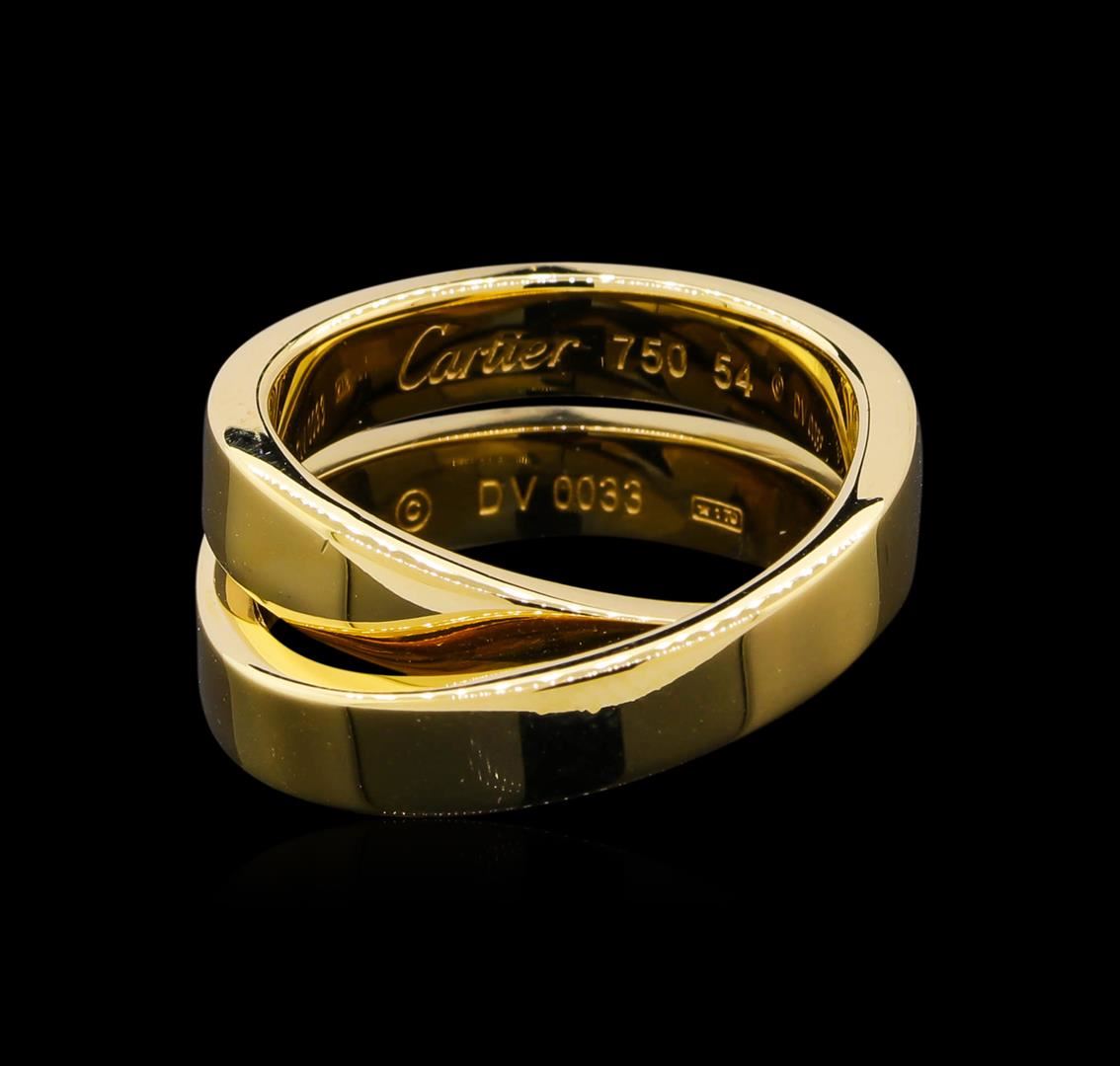 Dare to dazzle with this shiny 18KT yellow gold Cartier Nouvelle Vague Paris Crossover Band Ring. The ring is stamped "Cartier 750 54 DV 0033". This ring will make a perfect gift for a loved one. The simple but sleek design features a double crossover design at the front of the band. Total Weight of Ring: 15 grams. The ring comes with Cartier box.
