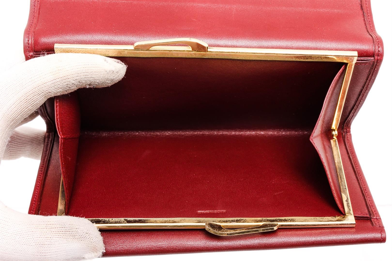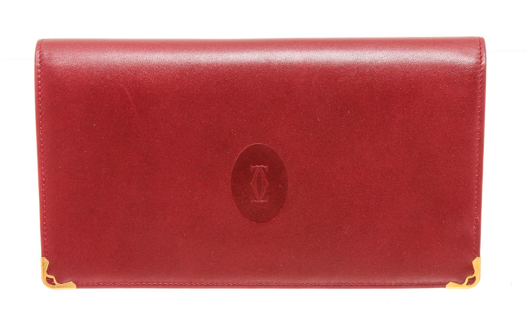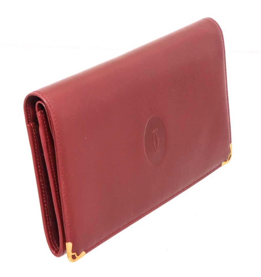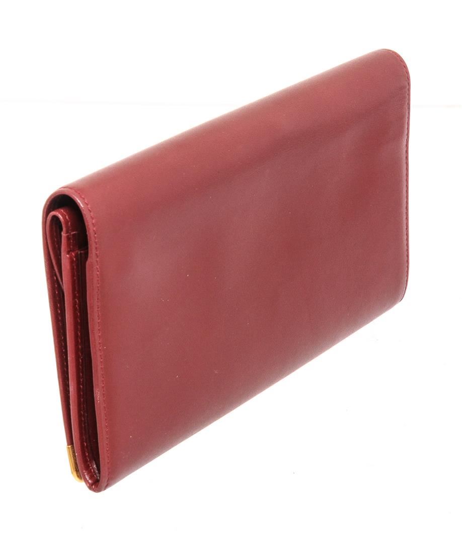 Cartier burgundy calfskin leather long bifold wallet with gold-tone hardware, Cartier insignia debossed at exterior, burgundy leather interior, interior coin pouch, slip pocket, zip pocket.