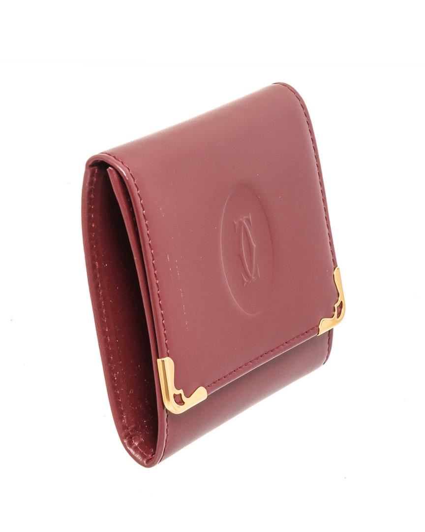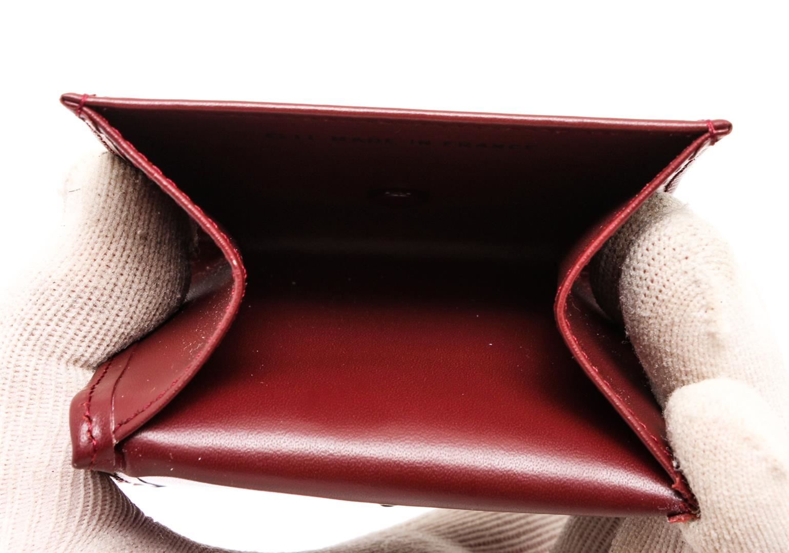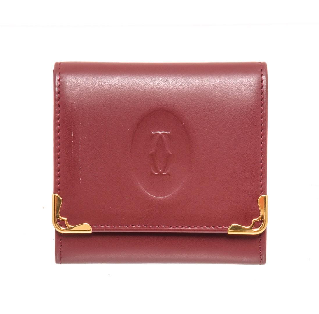 Cartier burgundy leather coin case wallet with gold-tone hardware, single interior compartment, flap with snap closure. Please note: Microscratching on front left, please see photographs.