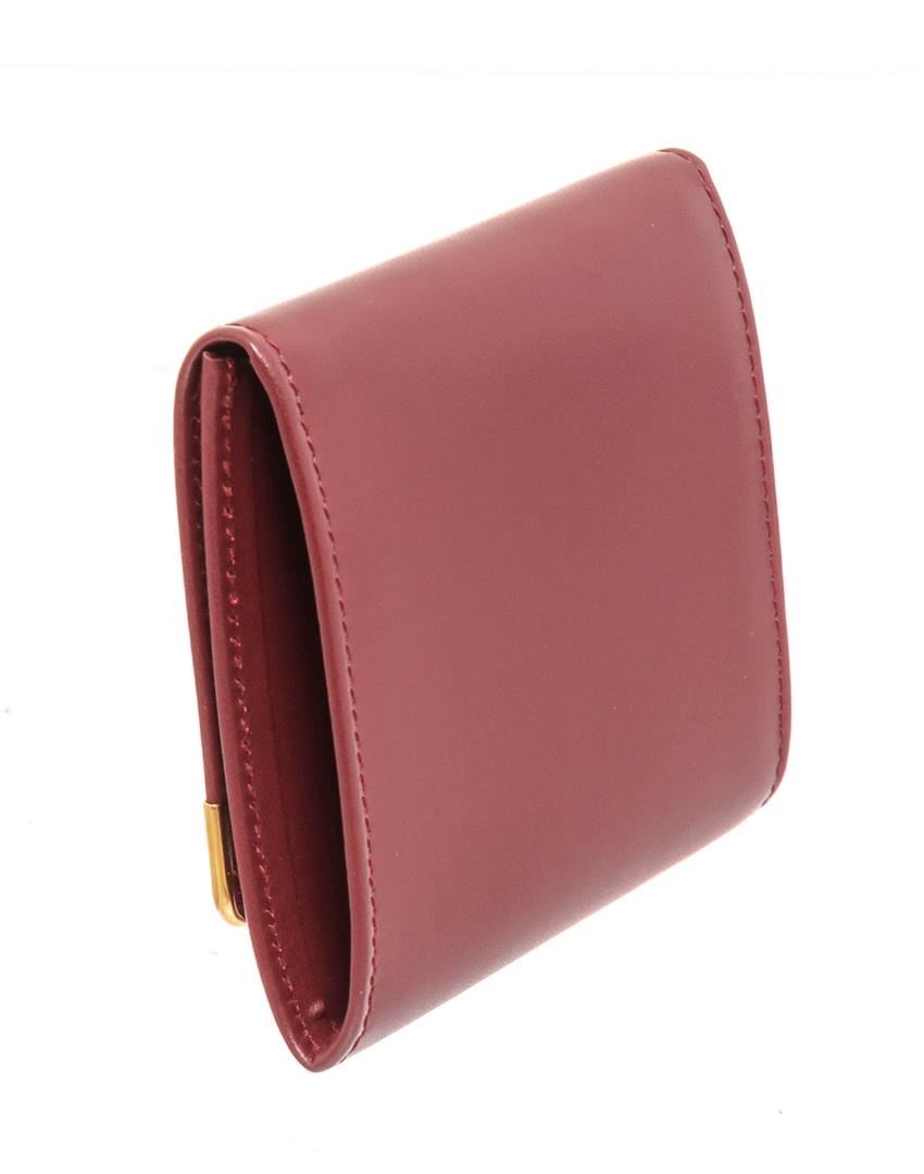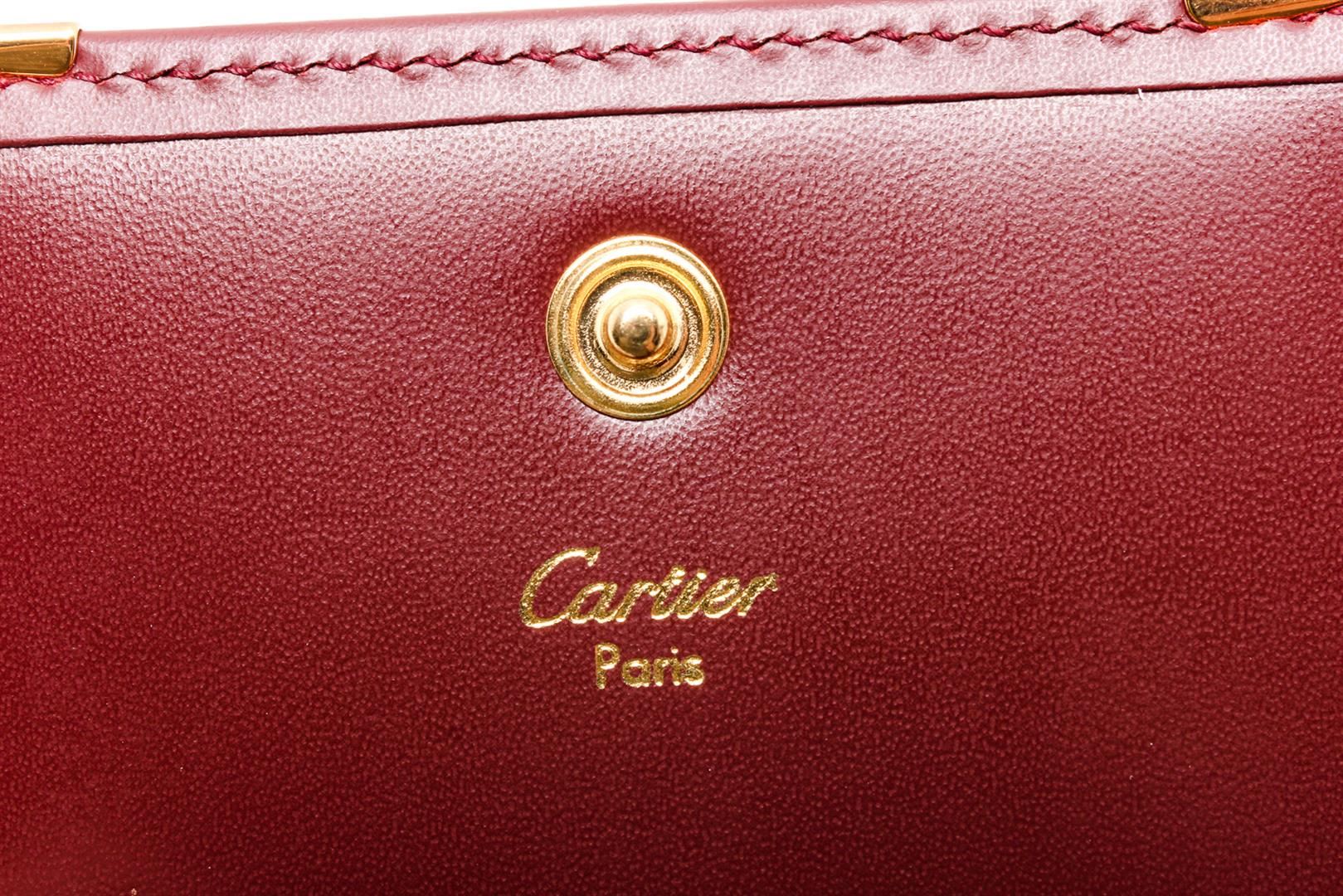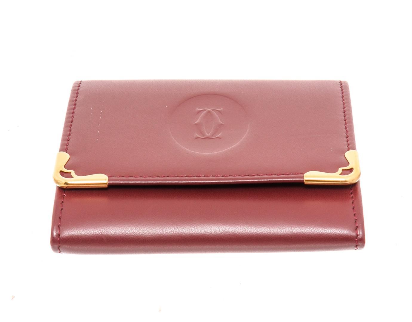 Cartier burgundy leather coin case wallet with gold-tone hardware, single interior compartment, flap with snap closure. Please note: Microscratching on front left, please see photographs.