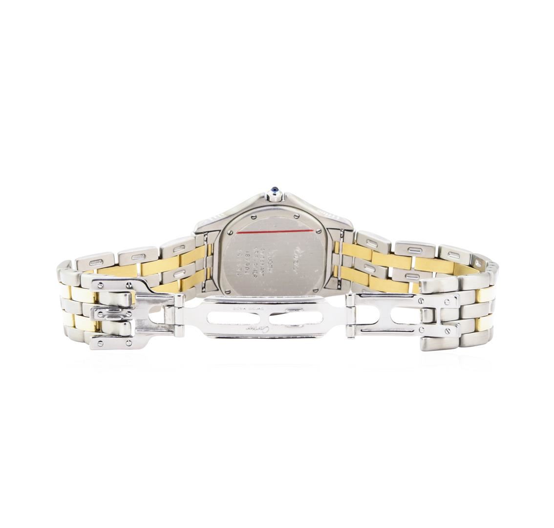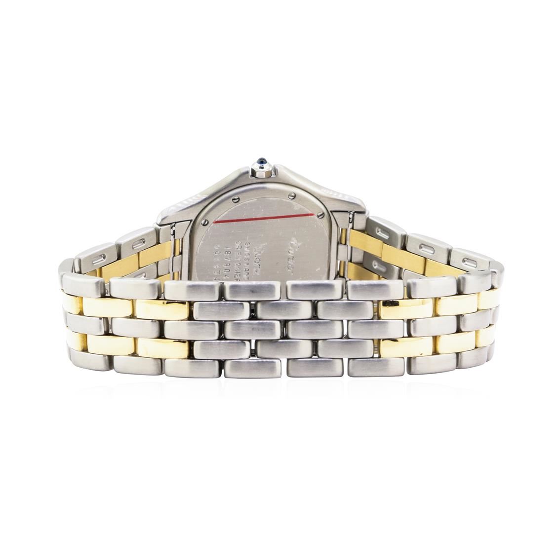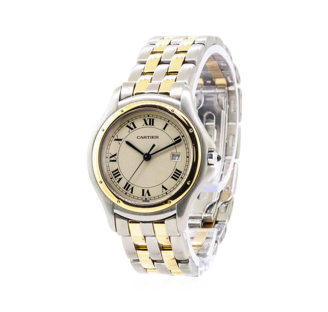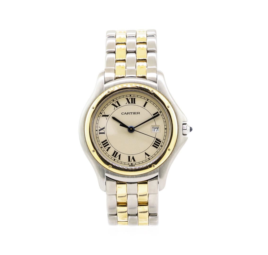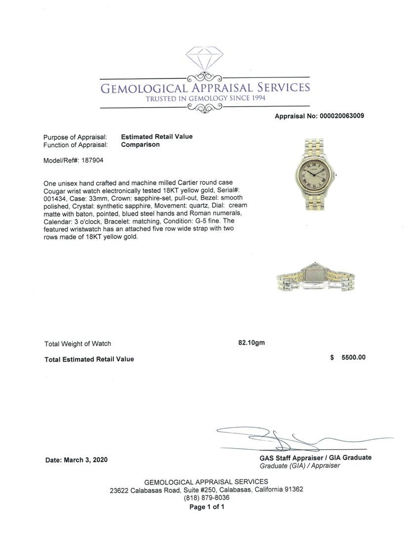 One unisex, hand crafted and machine milled Cartier round case Cougar wrist watch electronically tested 18KT yellow gold, Serial#: 001434, Case: 33mm, Crown: sapphire-set, pull-out, Bezel: smooth polished, Crystal: synthetic sapphire, Movement: quartz, Dial: cream matte with baton, pointed, blued steel hands and Roman numerals, Calendar: 3 o'clock, Bracelet: matching, Condition: G-5 fine. The featured wristwatch has an attached five row wide strap with two rows made of 18KT yellow gold.. Total Weight of Watch 82.10gm GAS Appraised at $5500.00. GAS Appraised.