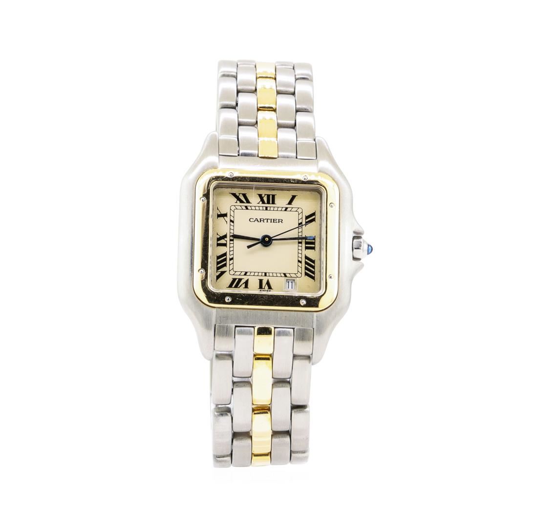 One man's, hand crafted and machine milled Cartier squared round Panthere wrist watch electronically tested 18KT yellow gold, Serial#: 9034368, Case: 27mm, Crown: sapphire set pull-out, Bezel: polished, Crystal: synthetic sapphire, Movement: swiss movement, Dial: cream satin with baton, pointed type hands and roman numerals, Calendar: 5 o'clock, Bracelet: matching, Condition: G-7 near mint. The featured lady's watch is crafted from stainless steel and 18KT yellow gold. The watch band has five rows of connected links, two of which are made of 18KT yellow gold.. Total Weight of Watch 67.40gm GAS Appraised at $4750.00. GAS Appraised.