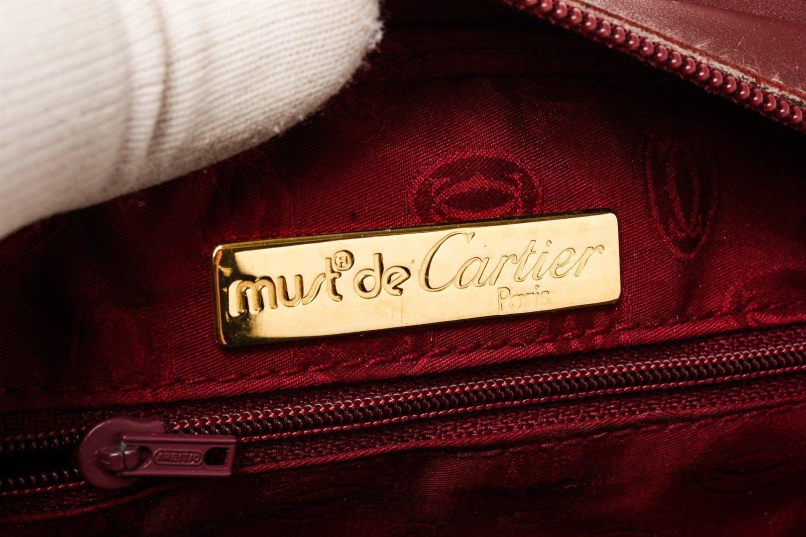 Cartier Red Leather Must de Cartier Shoulder Bag. All available information is listed in the description and shown in the photos. Red leather Cartier Must de Cartier shoulder bag with gold-tone hardware, dual rolled leather straps, a top zip closure, red logo jacquard lining, an interior zip and slip pocket. Size (HxWxD): 25cm x 20cm x 10cm / 9.84'' x 7.87'' x 3.93'', Handle Length: 44cm / 17.32''