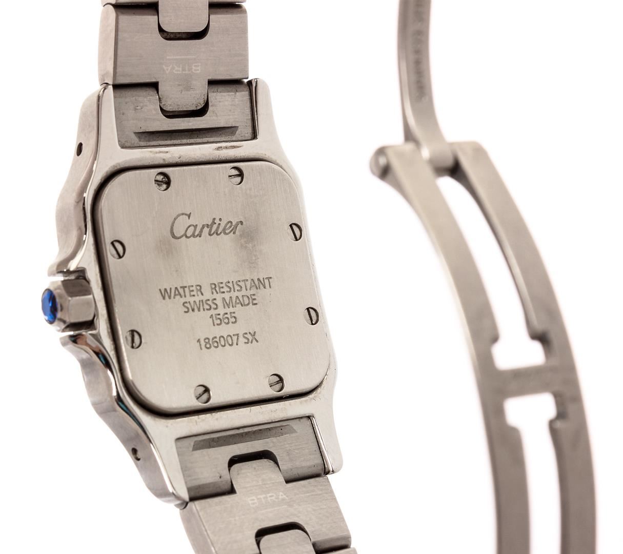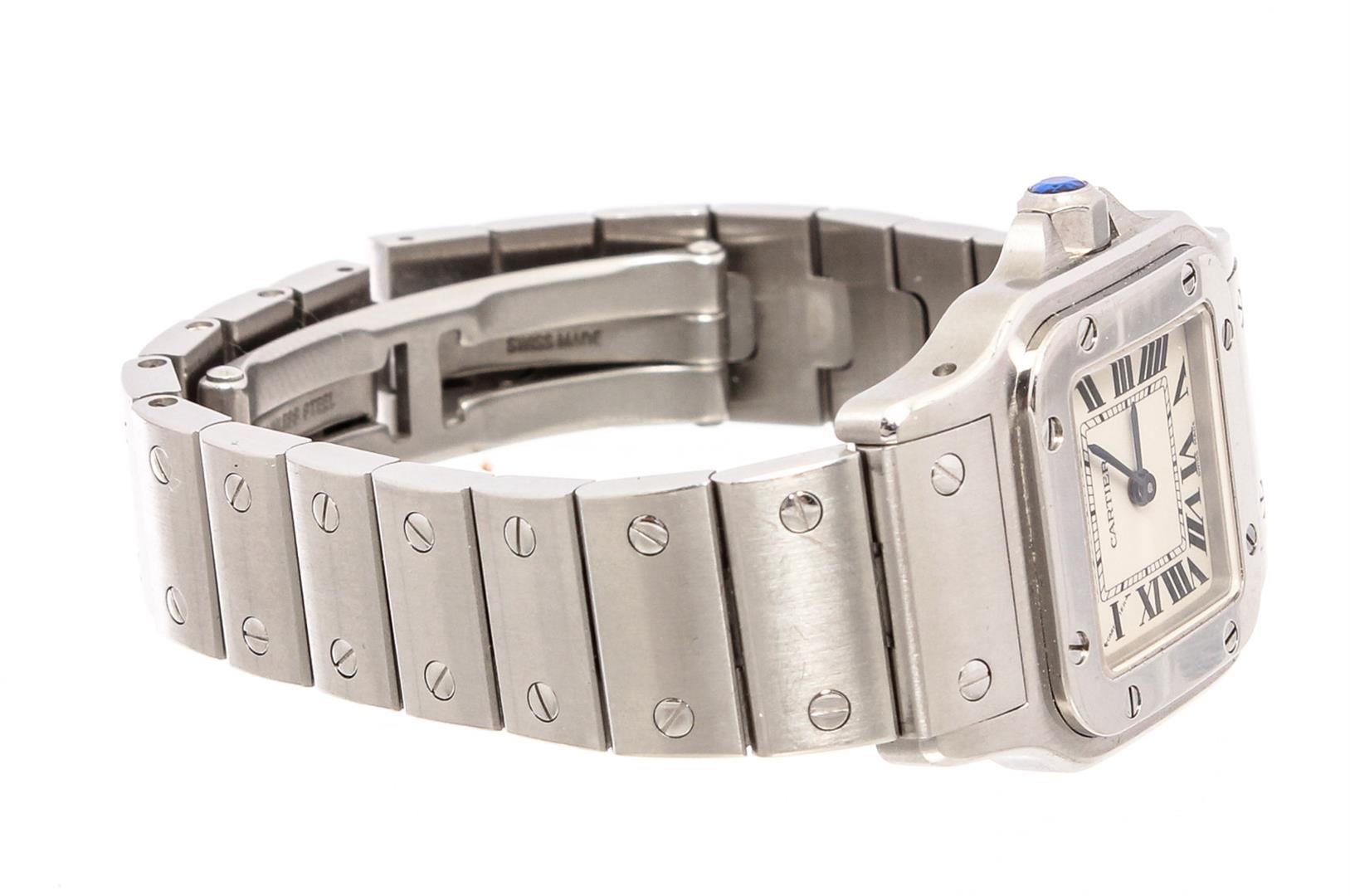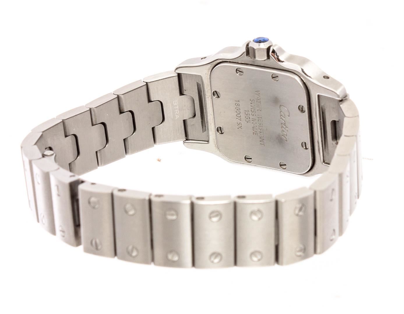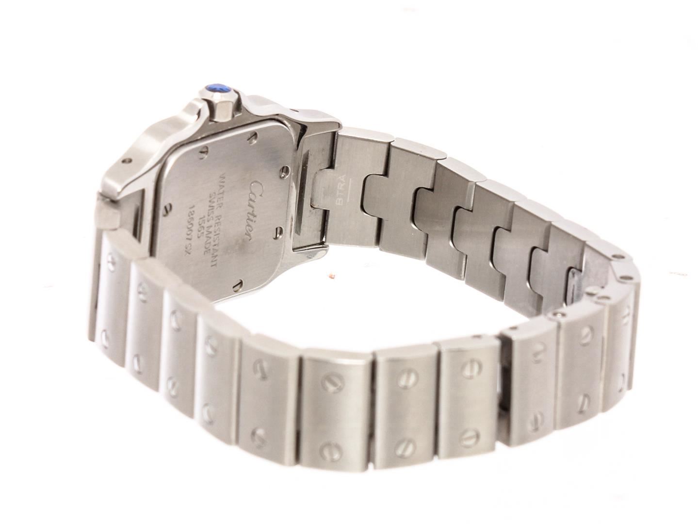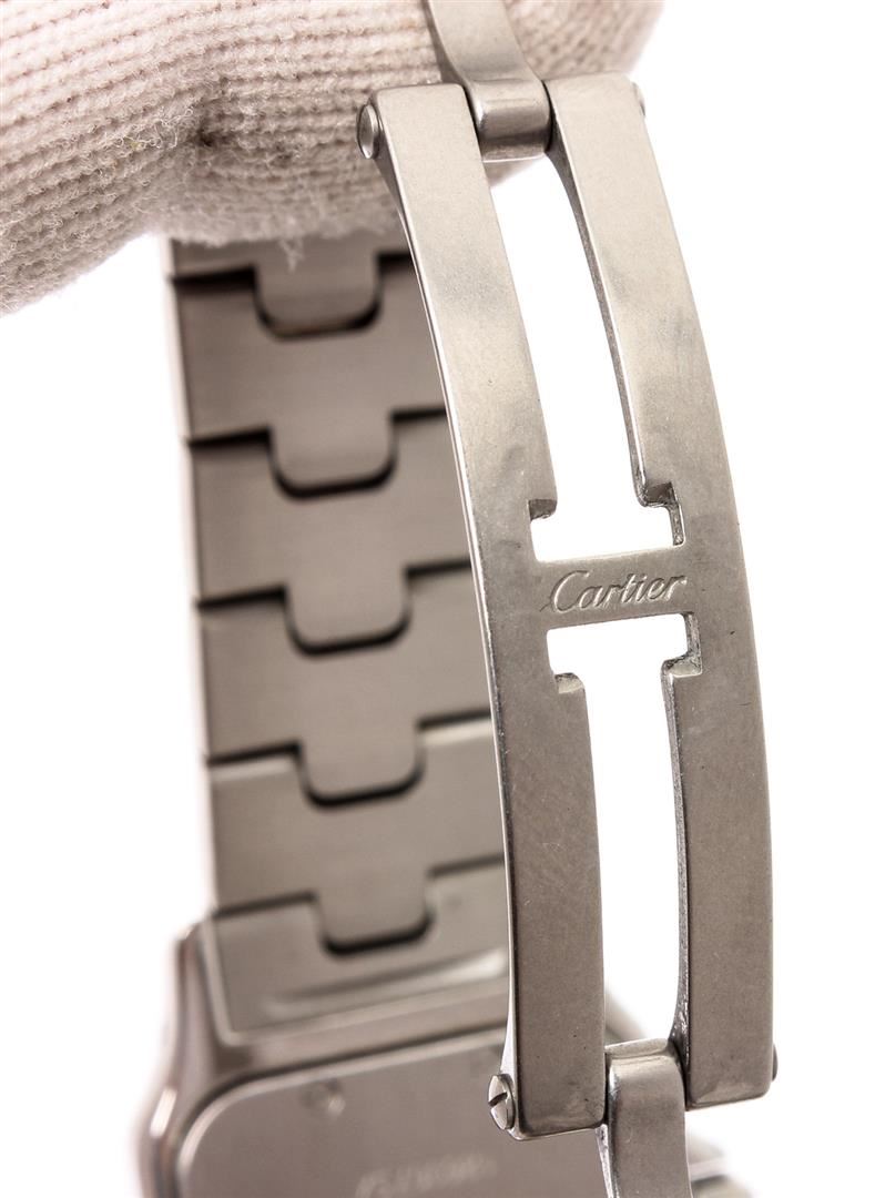 Cartier Santos Galbee Wrist Watch, 41 X 29 MM Stainless Steel Water Resistant case. Automatic, self winding Movement, Silver Engine Turned Dial with Raised Silver Markers, sweep seconds hand, Calendar window at the 3 position, scratch resistant Crystal and a Sapphire Crown. 5/8 inch wide Steel Santos Bracelet with a Deployment Clasp. Total watch length approximately 7.25 inches. Brand: Cartier Color: Stainless Steel Condition: Overall Good Condition and Functioning Properly (Please See Photographs) Style: 1564