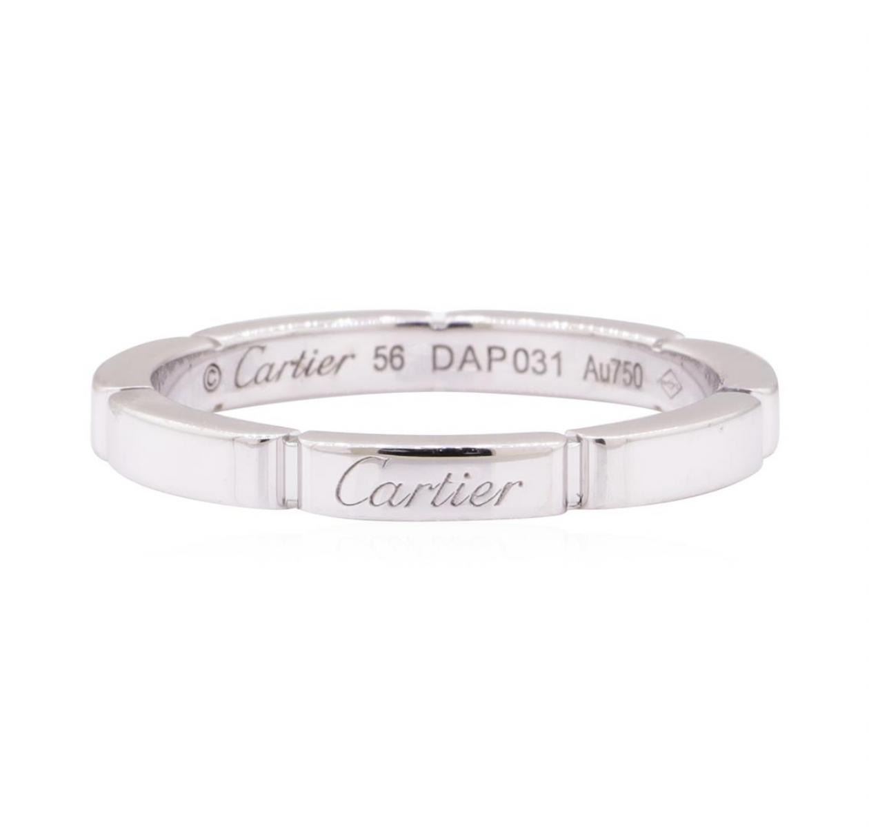 One Cartier wedding band featuring: 18KT white gold weighing 4.5 grams. The ring is engraved with serial number DAP031. The ring measures 2.50 millimeters wide and is European size 56, US size 7.75.