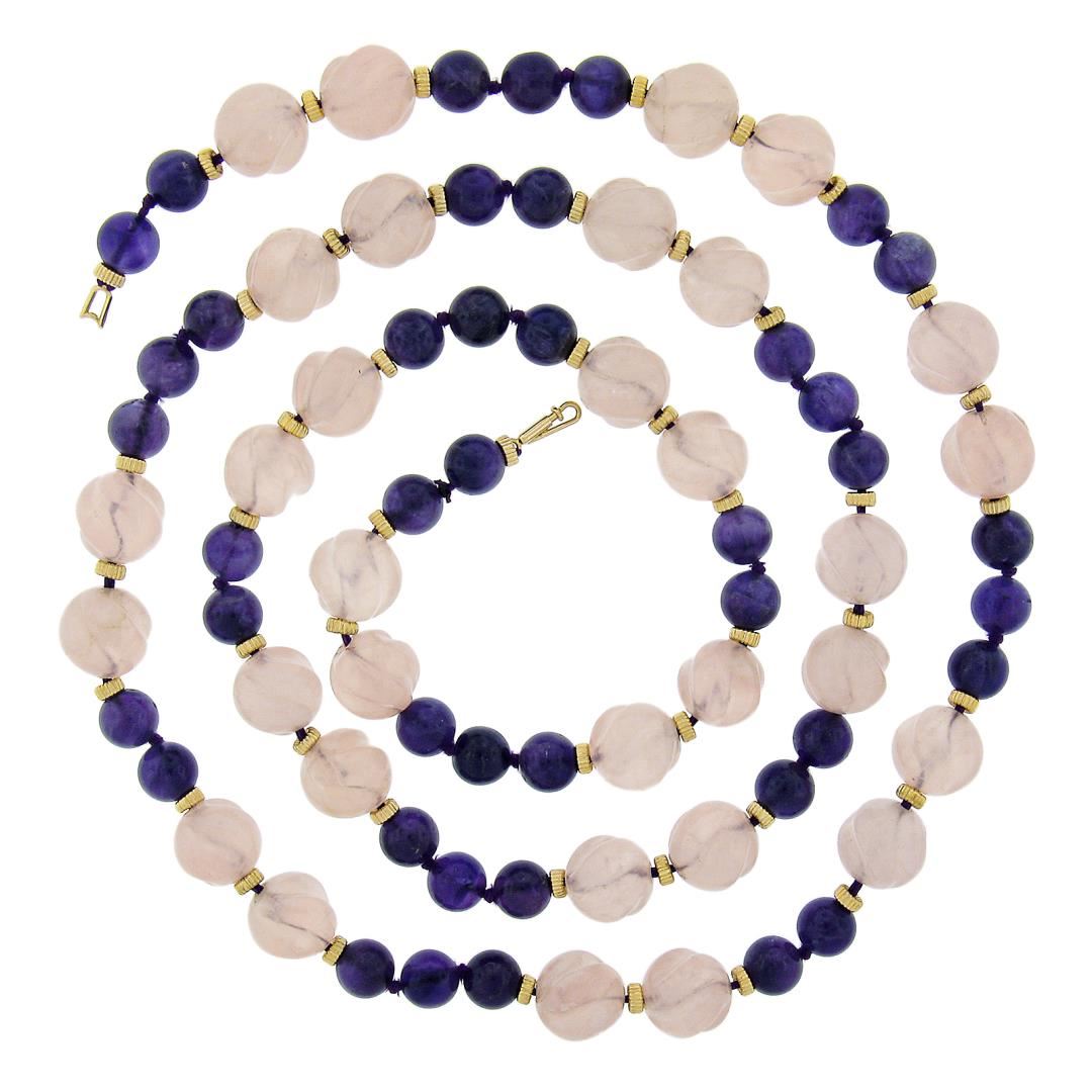 Alternated carved pink quartz (11.1-12.3mm), with round natural amethysts (8-8.2mm), and 14k yellow gold spacers strand necklace. It weighs a total of 102.74 grams, measures 12.3mm wide, and measures 34 inches in length.