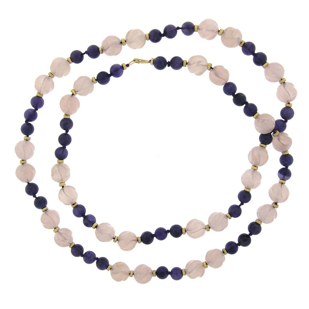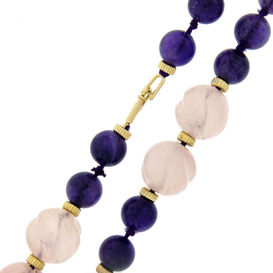 Alternated carved pink quartz (11.1-12.3mm), with round natural amethysts (8-8.2mm), and 14k yellow gold spacers strand necklace. It weighs a total of 102.74 grams, measures 12.3mm wide, and measures 34 inches in length.