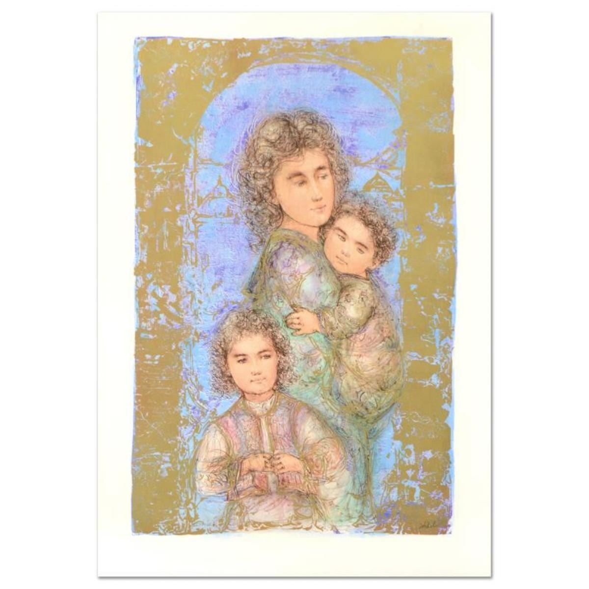 Catherine and Children by Hibel (1917-2014). "Catherine and Children" is a limited edition lithograph on paper by Edna Hibel (1917-2014), numbered and hand signed by the artist. Includes Certificate of Authenticity. Measures approx. 25" x 35" (border), 20" x 31" (image).